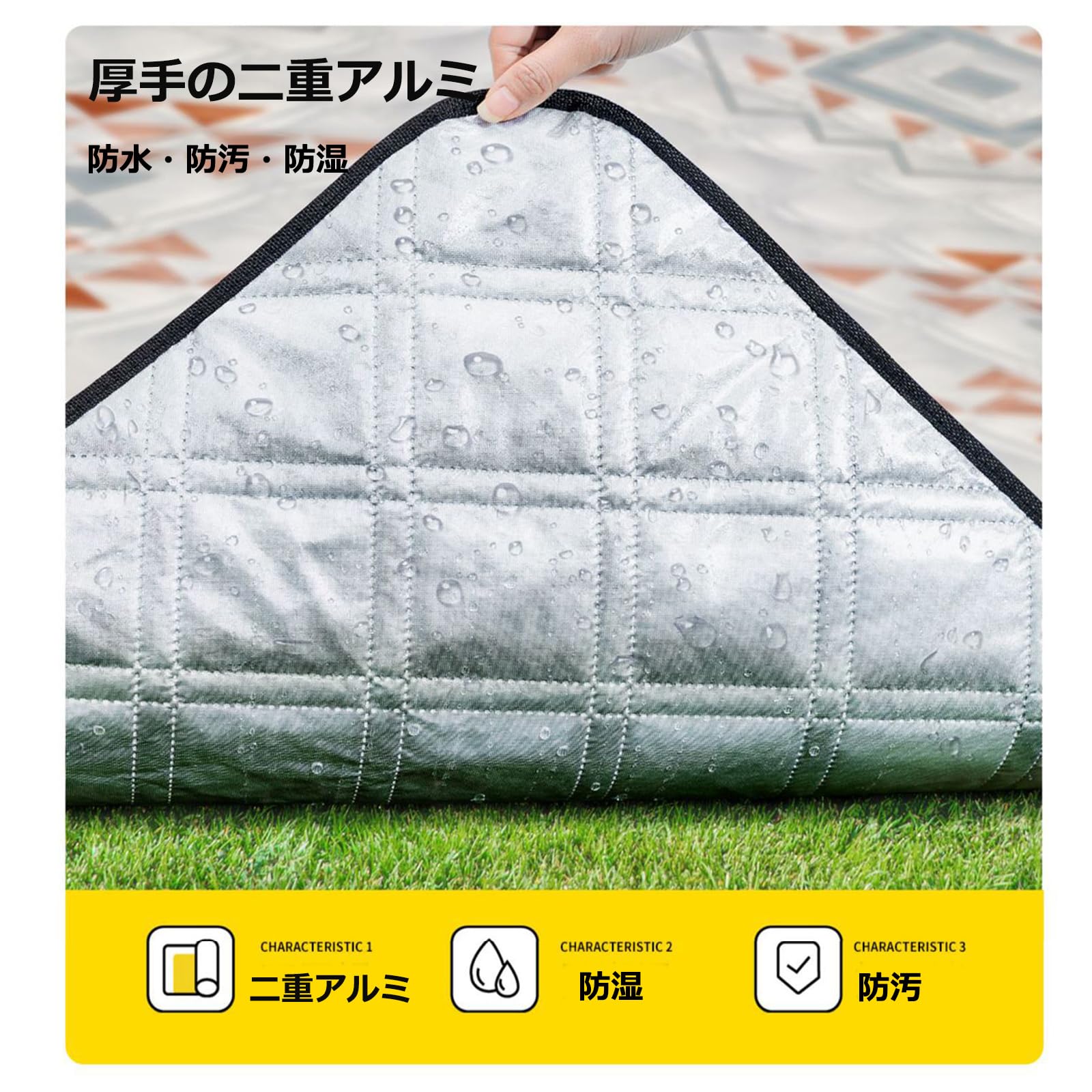 【5層構造】1.地面と接する裏面にアルミフィルムを使用しているため「防水性・断熱性・耐久性」に優れ、地面からの湿気や冷気をシャットアウトします。また、海水浴や川遊びで使う時に砂がくっつかずサラっと弾き返します。/2.真ん中に中綿が詰まっているため軽度のクッション性があります。3.表面はポリエステルのサラサラとした素材です。撥水加工を施しているため水分を弾いたり砂や草がくっつきにくいです。