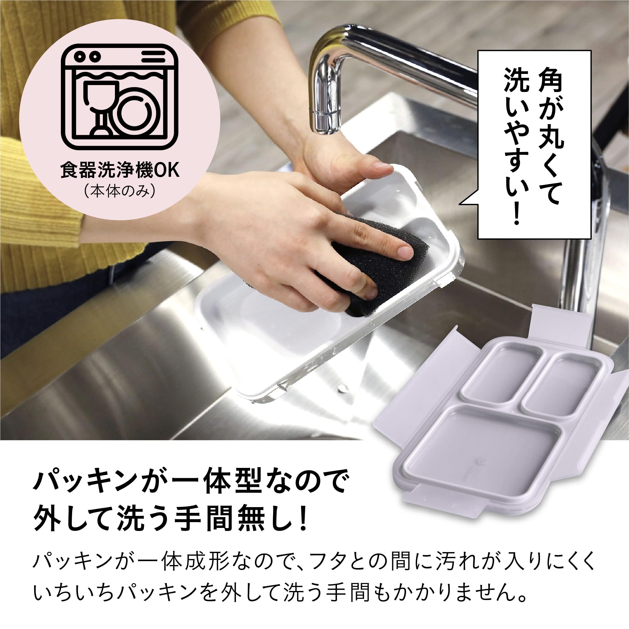 【汁漏れしにくい】一体型のパッキンと4点ロックで汁漏れを防止します!本体の周囲と中仕切りをシーリングするWシーリング構造で、汁漏れを防止します。各スペースの汁移りも防ぐので、おかずなどの味移りも防止します。※本商品は密閉容器ではありませんので、水分の多い物や汁物は入れないでください。漏れの原因になります。