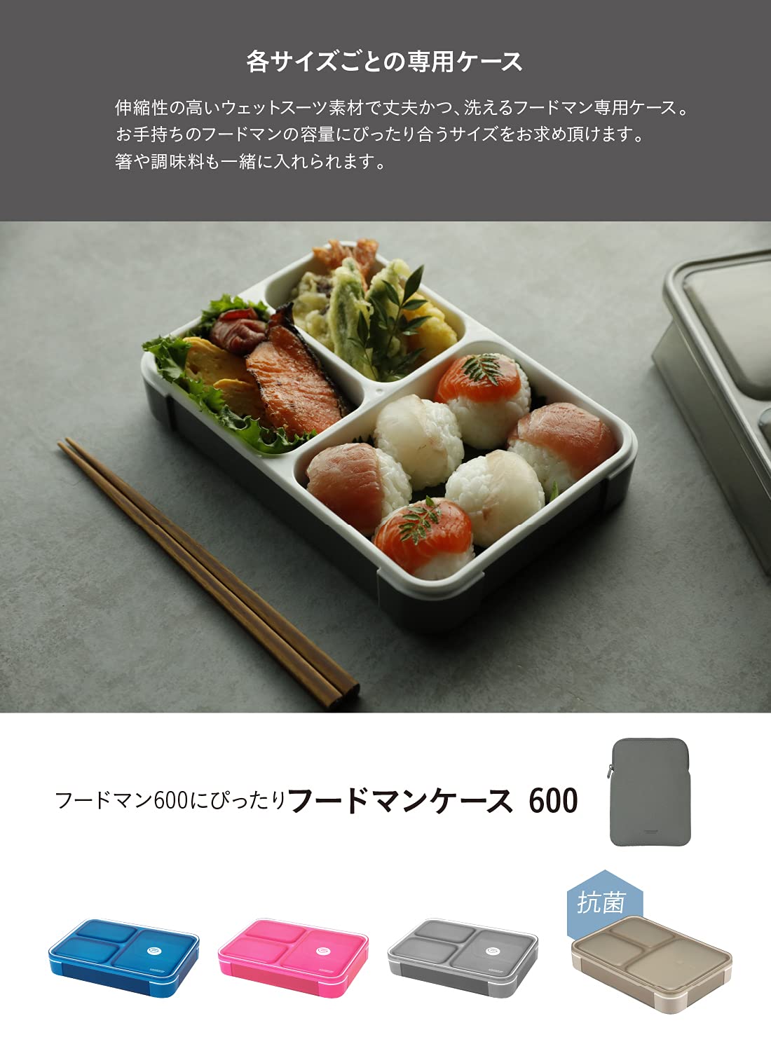ウェットスーツ素材で伸縮性が高く、丈夫で洗えるフードマン専用ケース。弁当箱にぴったりフィット。
