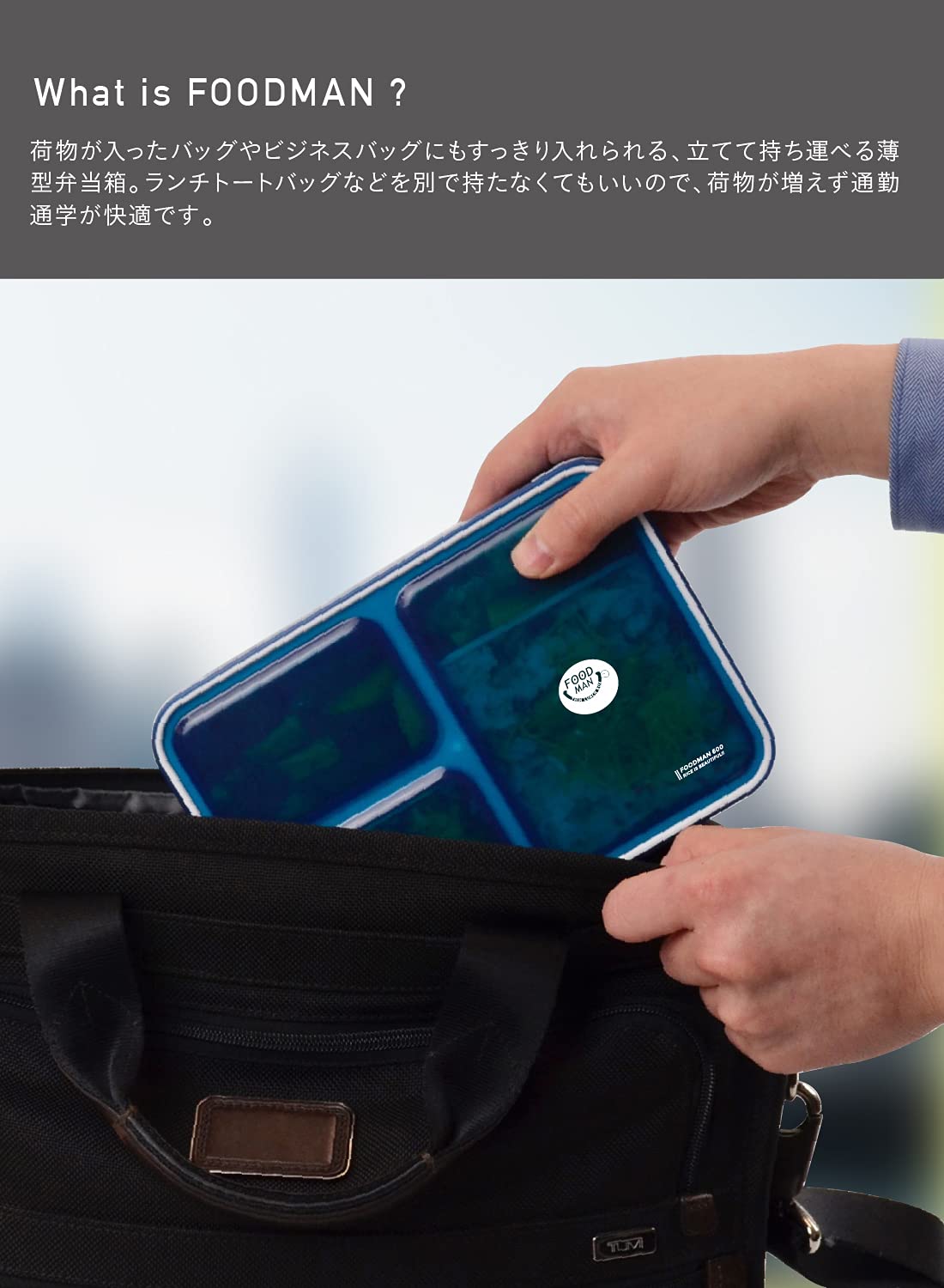 フードマンとは・・・ビジネスバッグや荷物が入ったバッグにもすっきり入れられる、立てて持ち運べる薄型弁当箱。ランチトートバッグなどを別で持たなくてもいいので、荷物が増えず通勤通学が快適です。