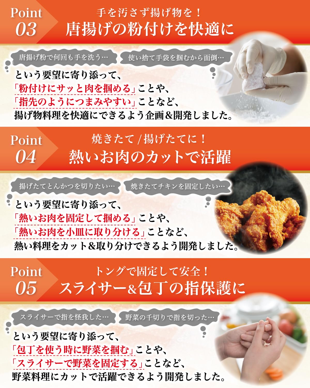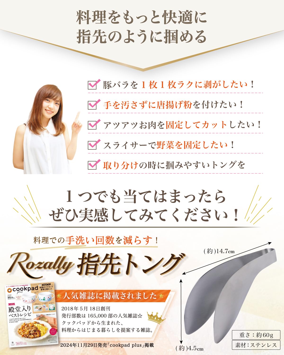 【こだわり】 様々なから キッチン 用品として ” 取り分けトング ”や” 盛り付けトング ”などステンレス製トング が日本製/中国製など様々に販売されていますが、 Rozallyの ゆび先トング は”こだわり”が一味違います。 小型サイズ[ミニサイズ]の設計で指先のようにフィットして使え、 手を汚すことなく料理を行うことができます。 また指先トング本体は食洗機対応なので、”水洗い”もラクラクです。