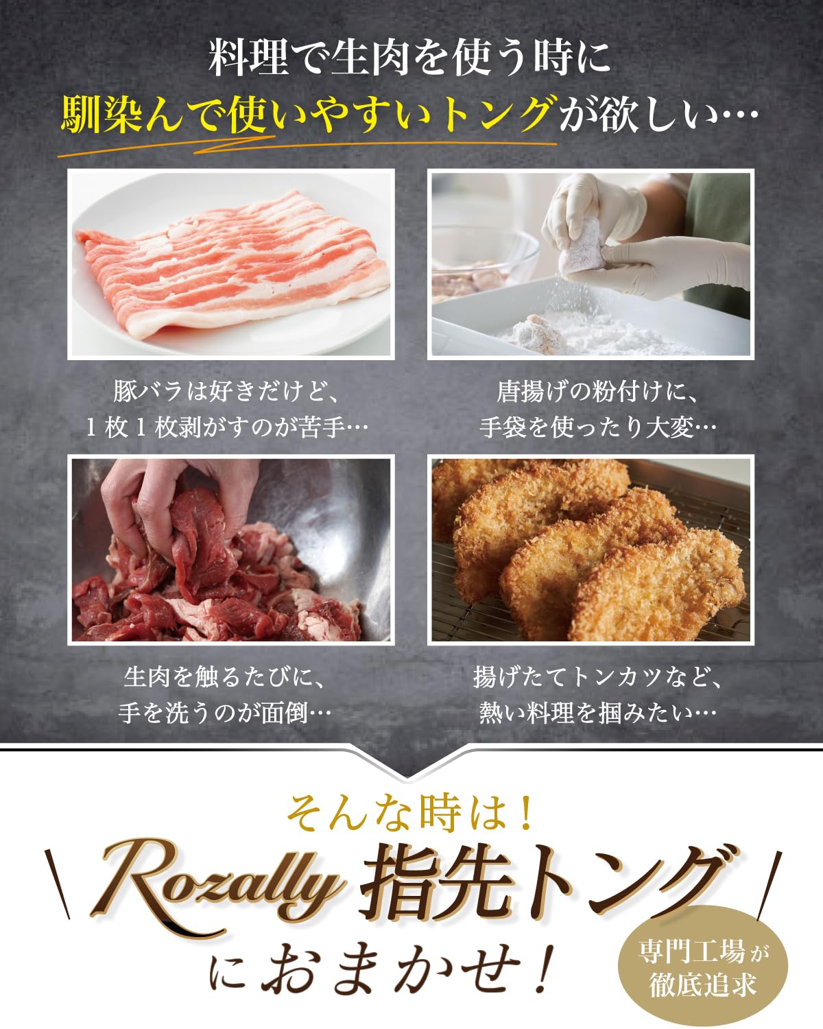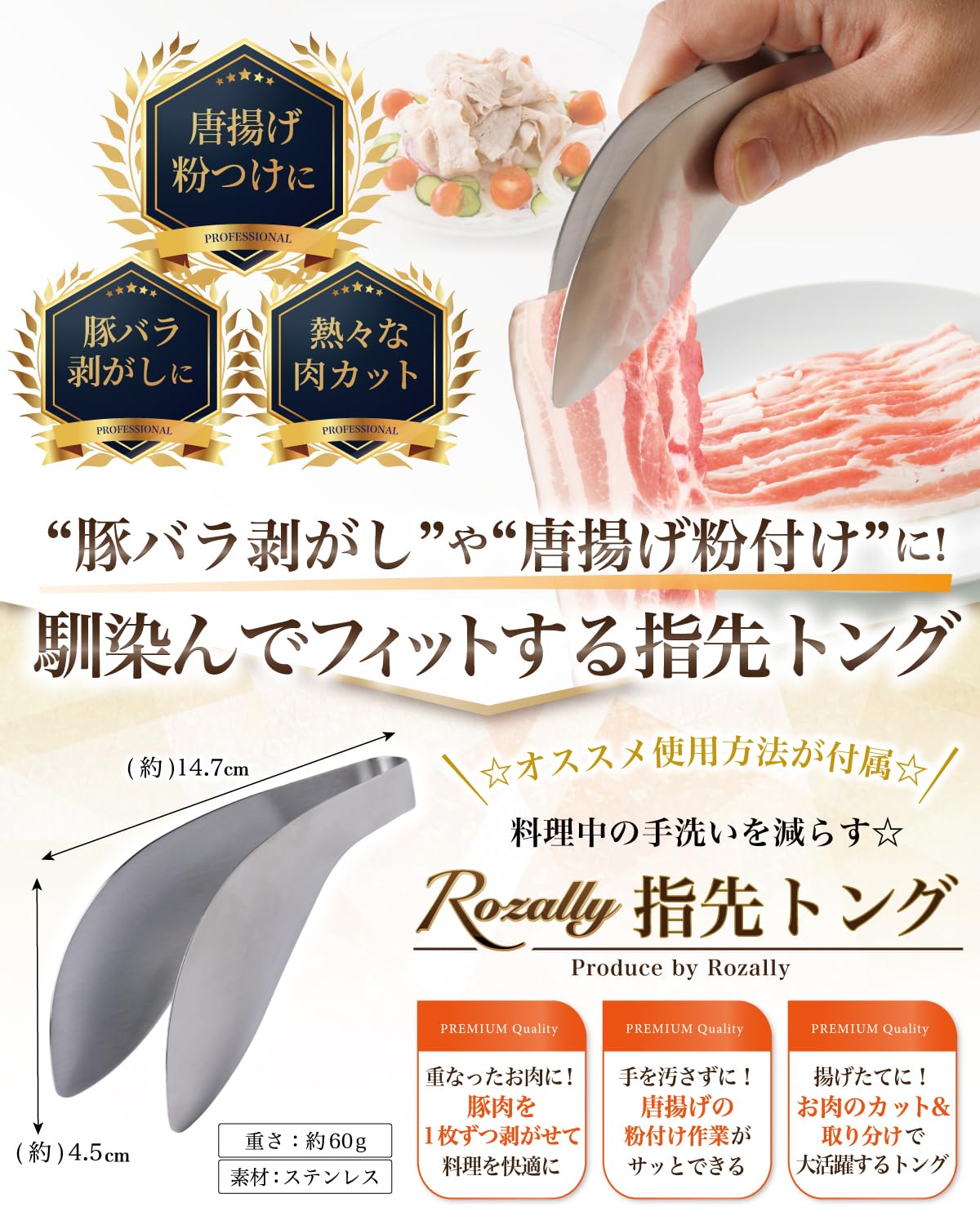 【キッチンで大活躍】 Rozally 指先トング (ゆびさきとんぐ) がついに正式販売開始。 「豚バラ肉を1枚1枚剥がしたい」「唐揚げ粉を付ける時に手を汚したくない」という お客様に人気の ステンレス 素材の ゆび先 ようなフィット感の トング です。 「生肉を触る度に手を洗うのが面倒…」「小回りの効くトングが欲しい…」 そんなお客様の声から生まれた指先にフィットして小さく使いやすいミニトングです。