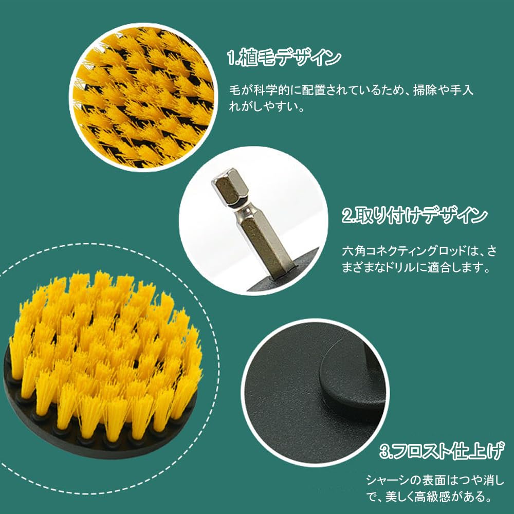 電動掃除用ブラシ 3枚セット 電動ドリルブラシ ドリル アタッチメントキット 六角軸電動ドリルに適応 浴室/キッチン/車輪/窓枠用 (イエロー)