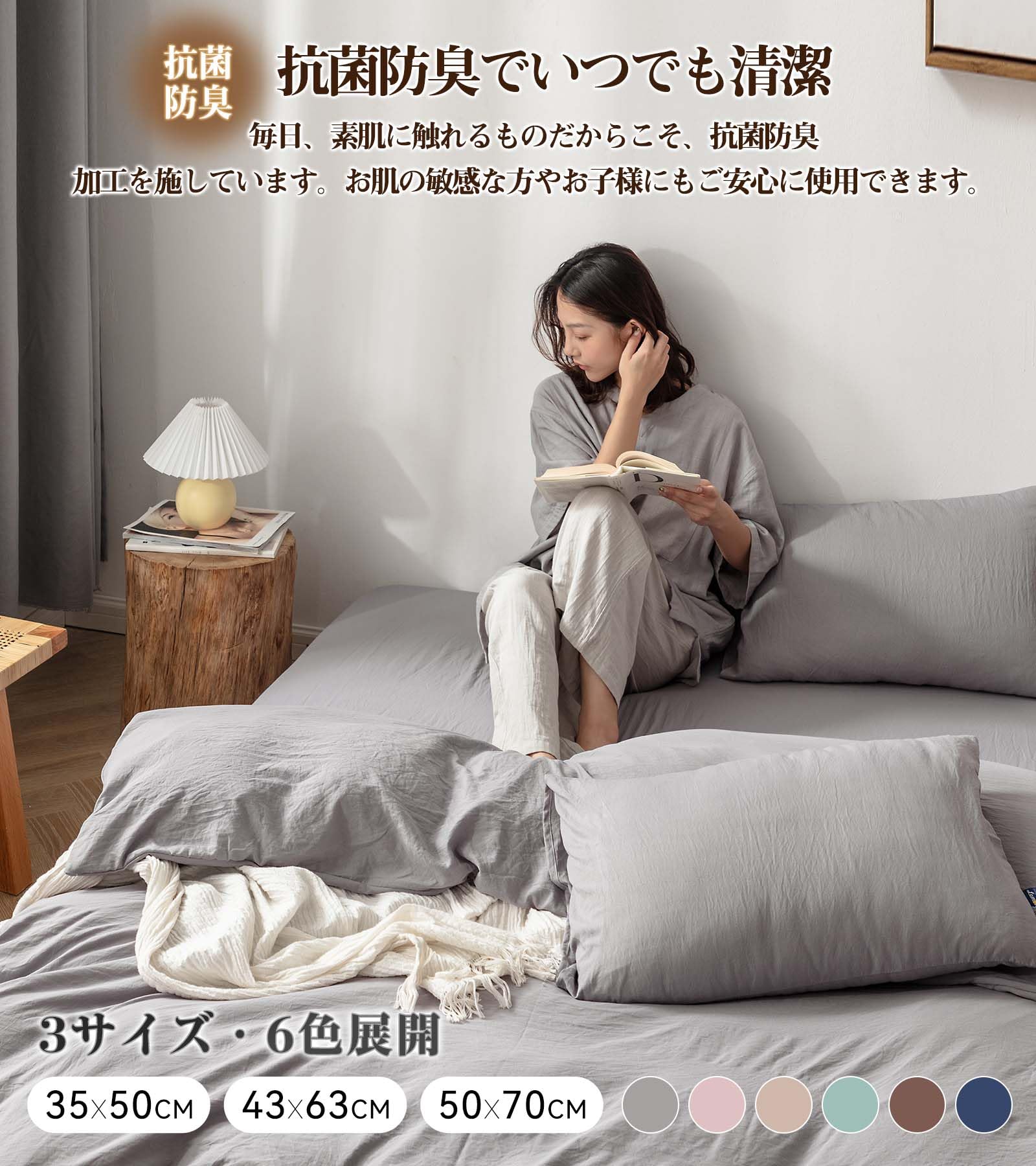 【水洗い加工まくらカバーの特徴】こだわり①「超吸水速乾 & 0秒吸水」まくらカバーは吸水速乾機能で汗をかいてもすぐに吸い取って乾きます。サラッとした肌触りでベタつきません。快適に眠ることができます。 こだわり②「優れた速乾性」水洗い加工のまくらカバーは速乾性に優れているので、湿気による細菌の増殖を抑えられます。夏は涼しく冬は暖か寝具で、オールシーズンに快眠環境を整えます。 こだわり③「通気性抜群&オールシーズン使える」水洗い加工で普通のピーチスキンピローケースと比べ、優れた吸湿性と通気性で、汗でもベタつかないサラサラ感を保ちます。ムレにくく、春夏秋はサラサラ、冬は暖かくて一年中快適にお休みいただけます。 丁寧に織り上げることにより、耐久性にも優れたしっかりとした生地に仕上がったピローケースです。 こだわり④「抗菌防臭」汗の量が多い方にもオススメな枕カバーです。良い抗菌防臭効果で細菌の増殖を抑制し、防臭効果を発揮します。毎日、素肌に触れるものだからこそ、抗菌防臭加工を施しています。お肌の敏感な方やお子様にもご安心に使用できます。