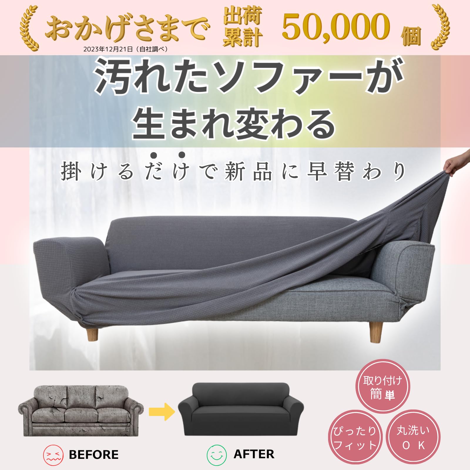 【専用カバーのようなフィット感】あらゆるサイズのソファーにジャストフィット。伸縮性に優れた素材で、ワンタッチで女性1人でも簡単に装着出来るのが嬉しい!
