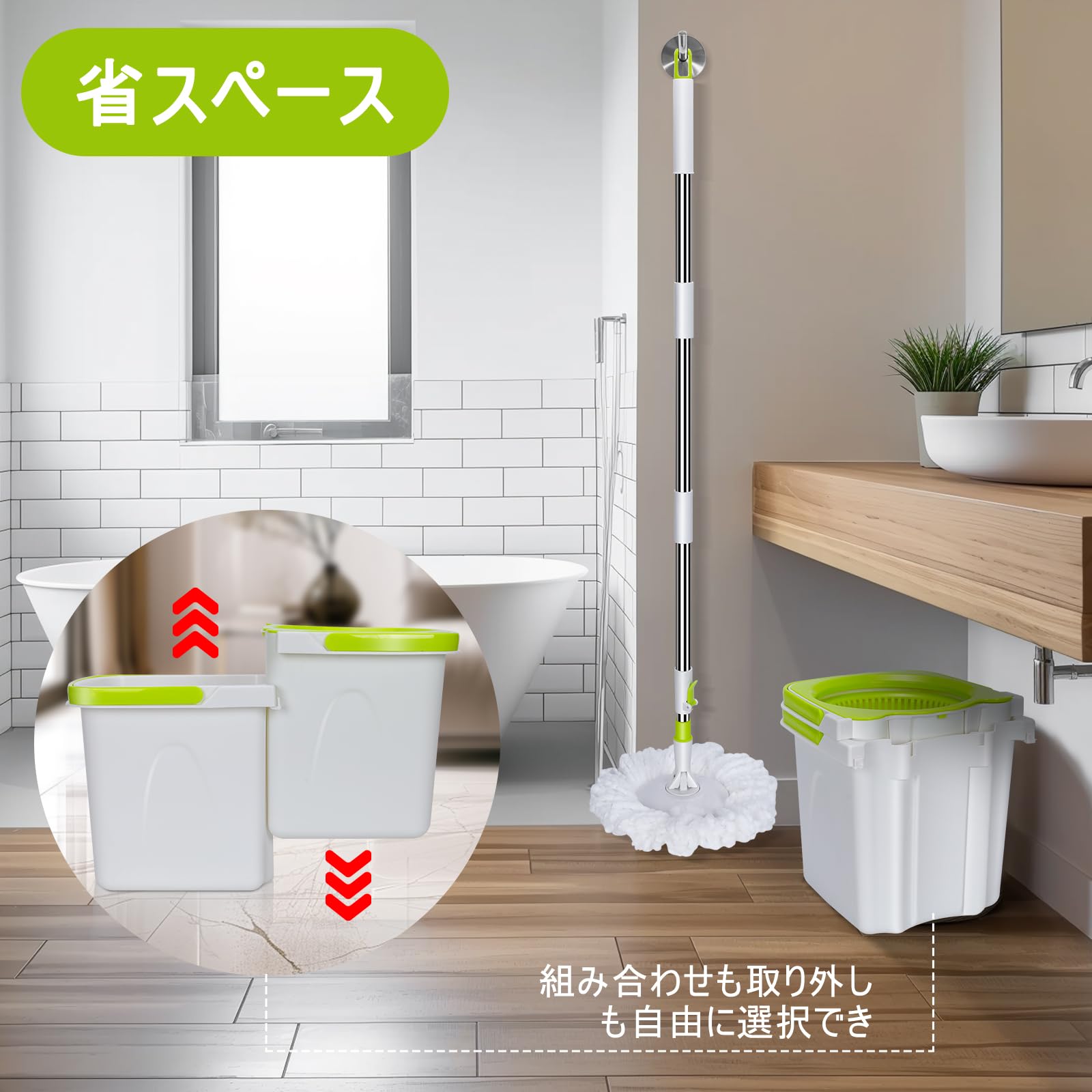 収納と取り付け:上下に動かすだけで、2つのバケツを組み合わせたり、取り外したりできます。分割後は2つのバケツを重ねて収納棚などに入れることができ、モップは場所を取らずに壁に掛けることができます。工具を追加することなく、ねじったり回したりして床掃除モップを組み立てることができ、とても便利です。