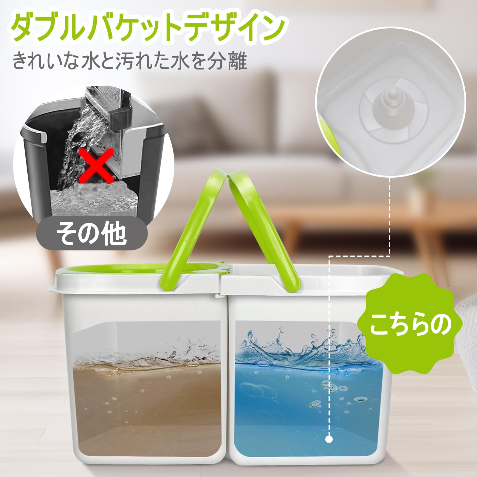 二つバケツデザイン: 巧みなダブルバケツデザインが、汚れた水を分離できます。 洗浄槽には水がきれいなままで、効果的に水の無駄を防ぎます。バケツを取り外して、それぞれのバケツを独立した部分として、家にはほかのモップや雑巾などと一緒に使用でき、用途が広がります。