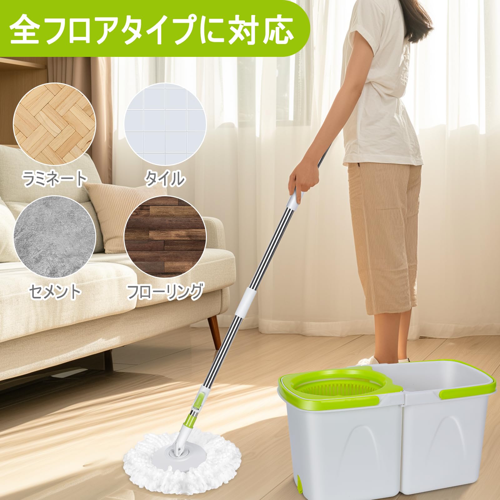 効率的なお掃除:180度回転式モップヘッドので、ベッドの下やソファーの下など、手の届きにくい場所でもお掃除できない心配がありません。回転モップとバケツセットには、洗濯機で洗えて再利用可能な、強力な吸水性と吸着力を持つマイクロファイバーモップパッドが3枚付きます。全床タイプに対応できます。