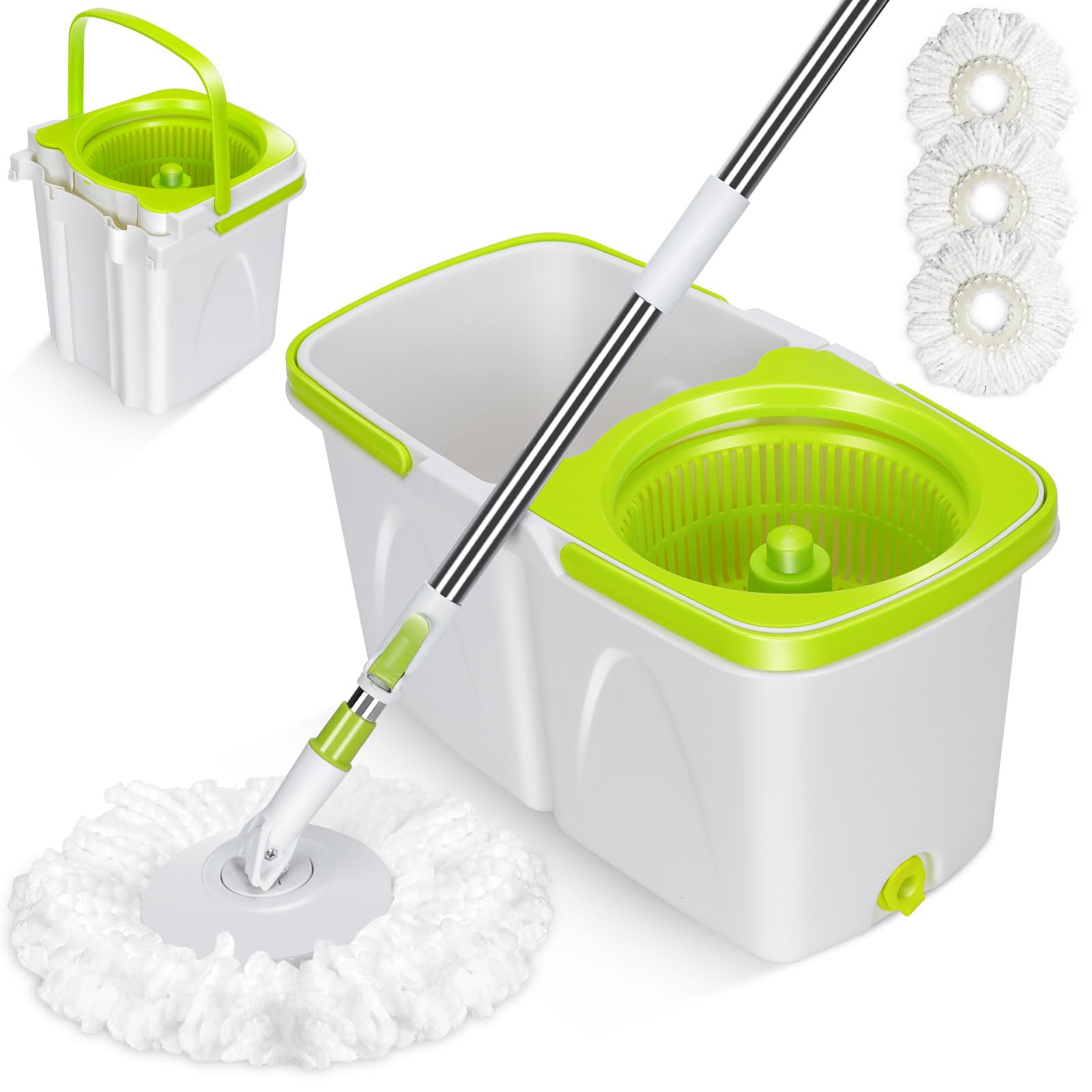 Masthome 回転モップ 取り外し可能なバケツ付き 床拭きモップ フローリング掃除 乾湿両用 3枚モップパッド付き 業務用家庭用 調節可能ハンドル 腰への負担軽減 手洗い不要 簡単に組み立て 耐久性あり 全フロアに対応 軽量 省スペース