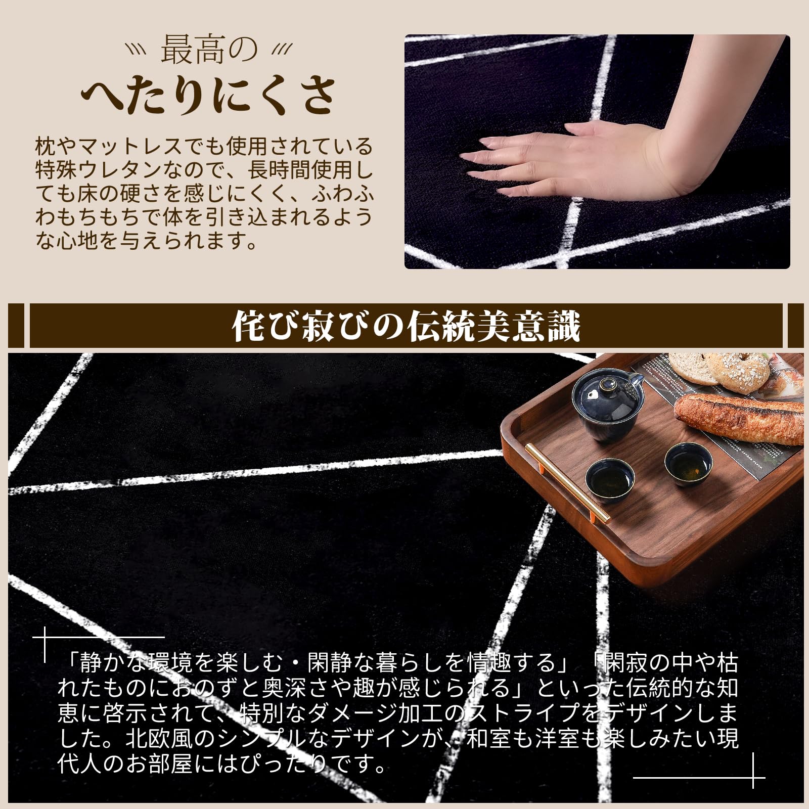 【伝統的な美意識】カーペットに特殊な模造ダメージ加工ストライプが施されており、シンプルで侘び寂びの美を強く感じさせ、優雅な雰囲気を演出してくれます。玄関、書斎、床暖房、キッチン、リビングルーム、スタディルーム、寝室、バスルーム、ダイニングルーム、廊下などの場所に最適です。