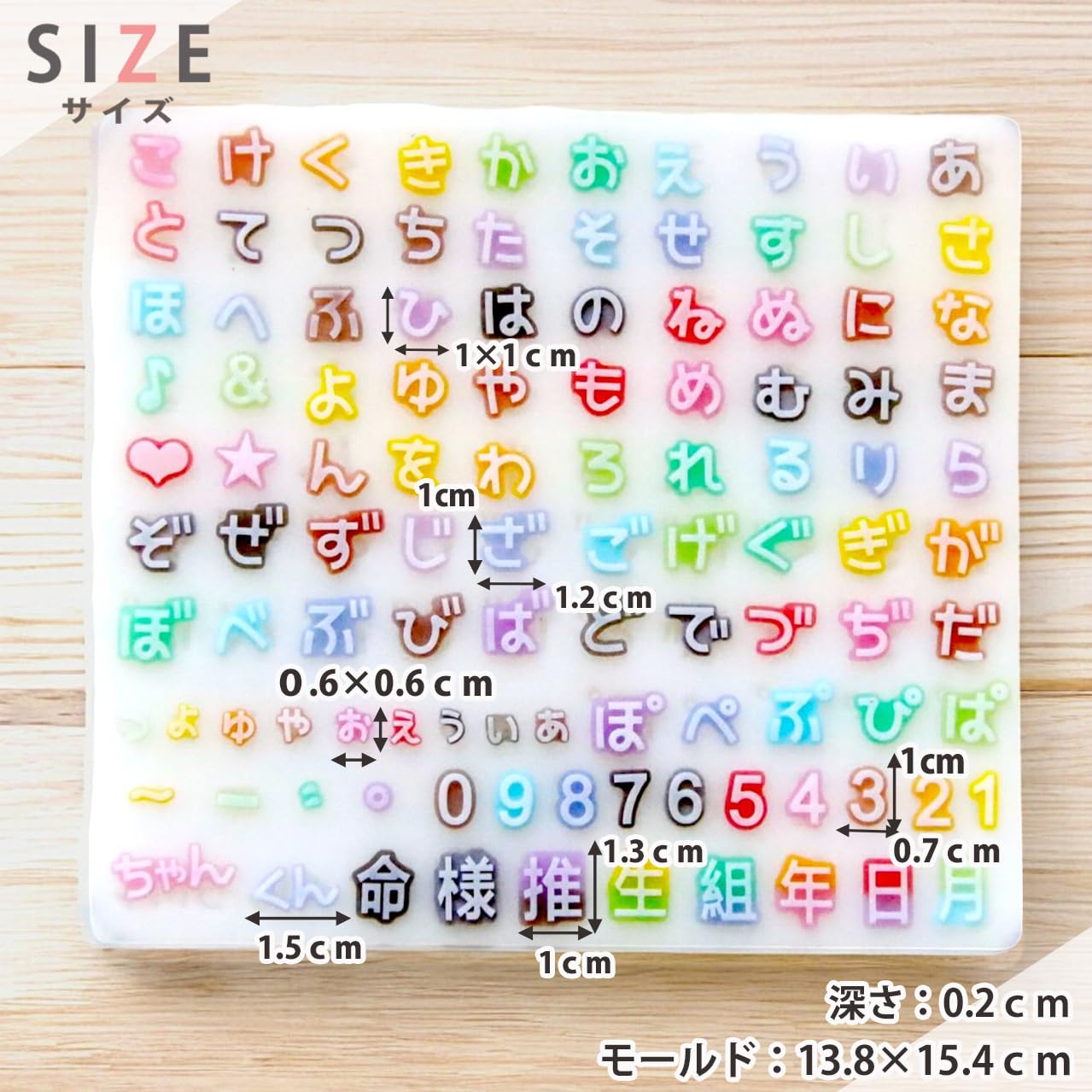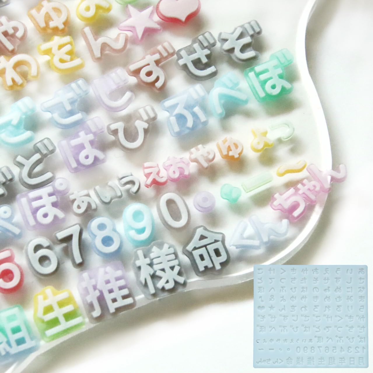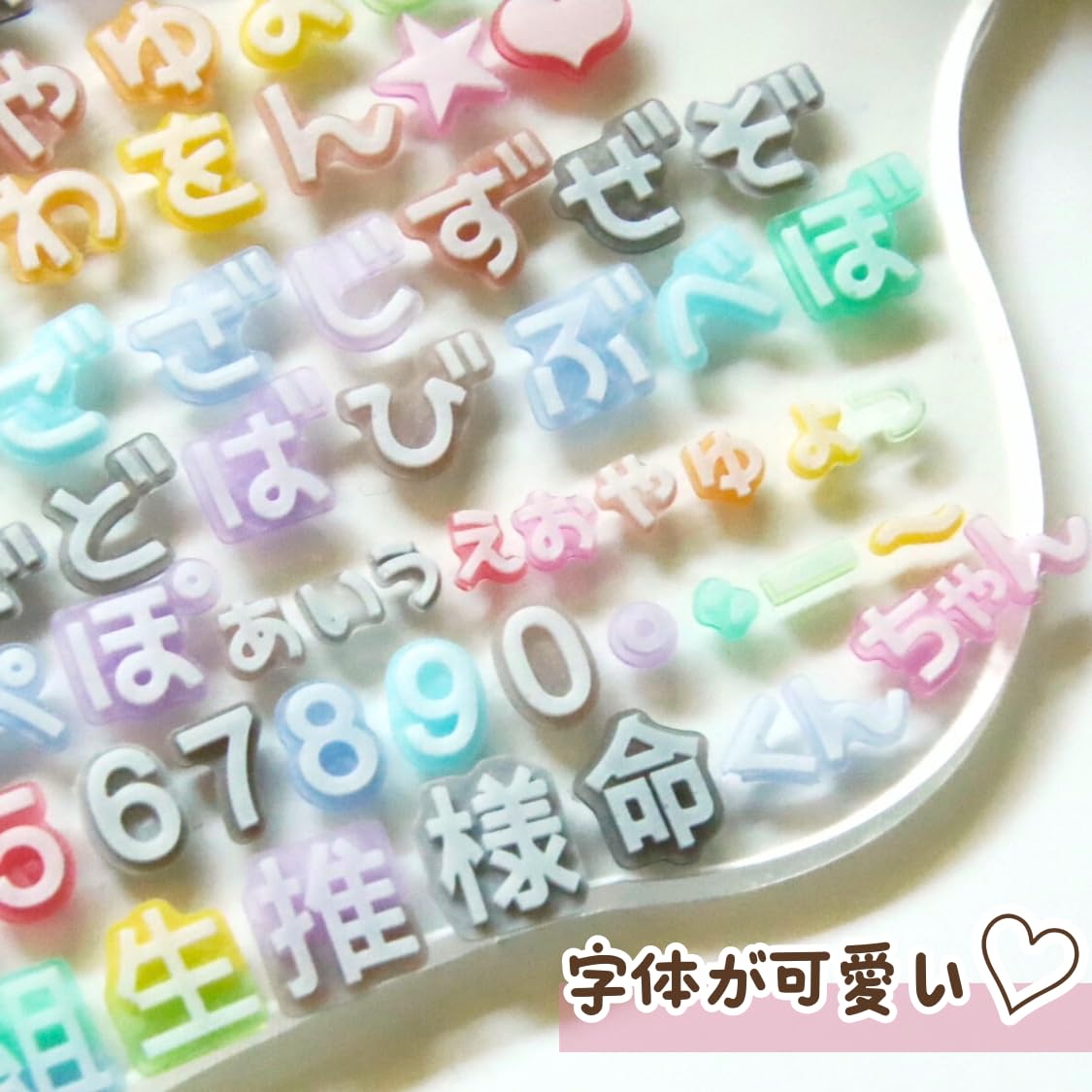 ?【商品について】ひらがなと漢字・数字・パーツ・記号が作れるシリコンモールドです。かわいいフォントのひらがなと濁点・半濁点・拗音とハート・星・音符などのパーツ、 命・様・推・生・組・年・日・月の漢字、ちゃん・くん、数字が一度に作れます♪ 小さい文字でとってもかわいい!アレンジ機能バツグン!キーホルダーなどの名前入れやにもちょうどいいサイズです。オタ活・推し活のグッズ作りやトレカデコにも最適です♪ UVレジン、エポキシ樹脂、樹脂粘土などにご利用いただけます。