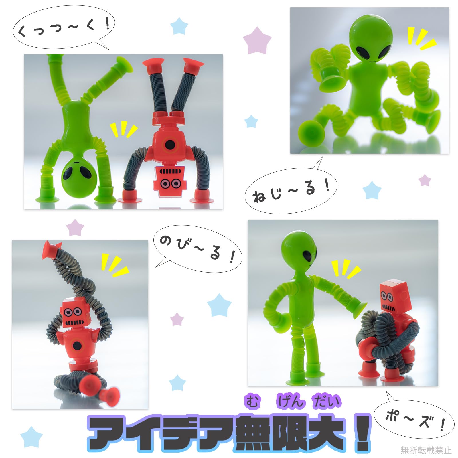 伸ばしたり、回転させたり変形可能な吸盤玩具。子供たちの創造性と遊び心を刺激します!