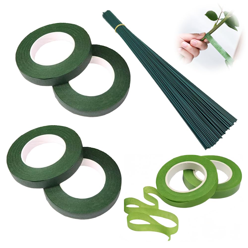 【新着特価】造花用フローラルテープ 6巻セット(薄緑2+濃緑4)&茎ワイヤー100本|リップケース収納可能 手工芸 DIY 仏花 ウェディングブーケ用 日本製 30cm 強粘着 完璧なパッケージ