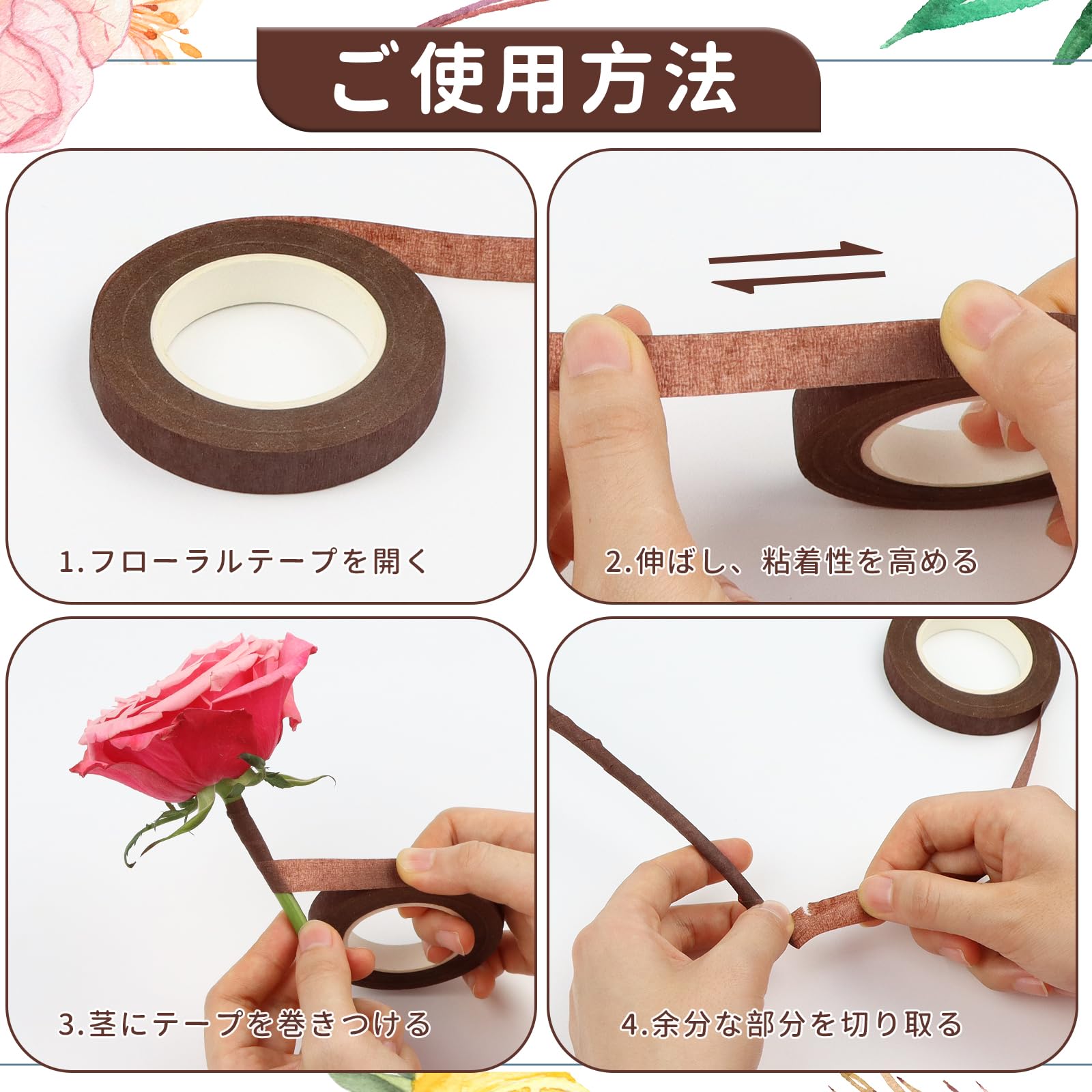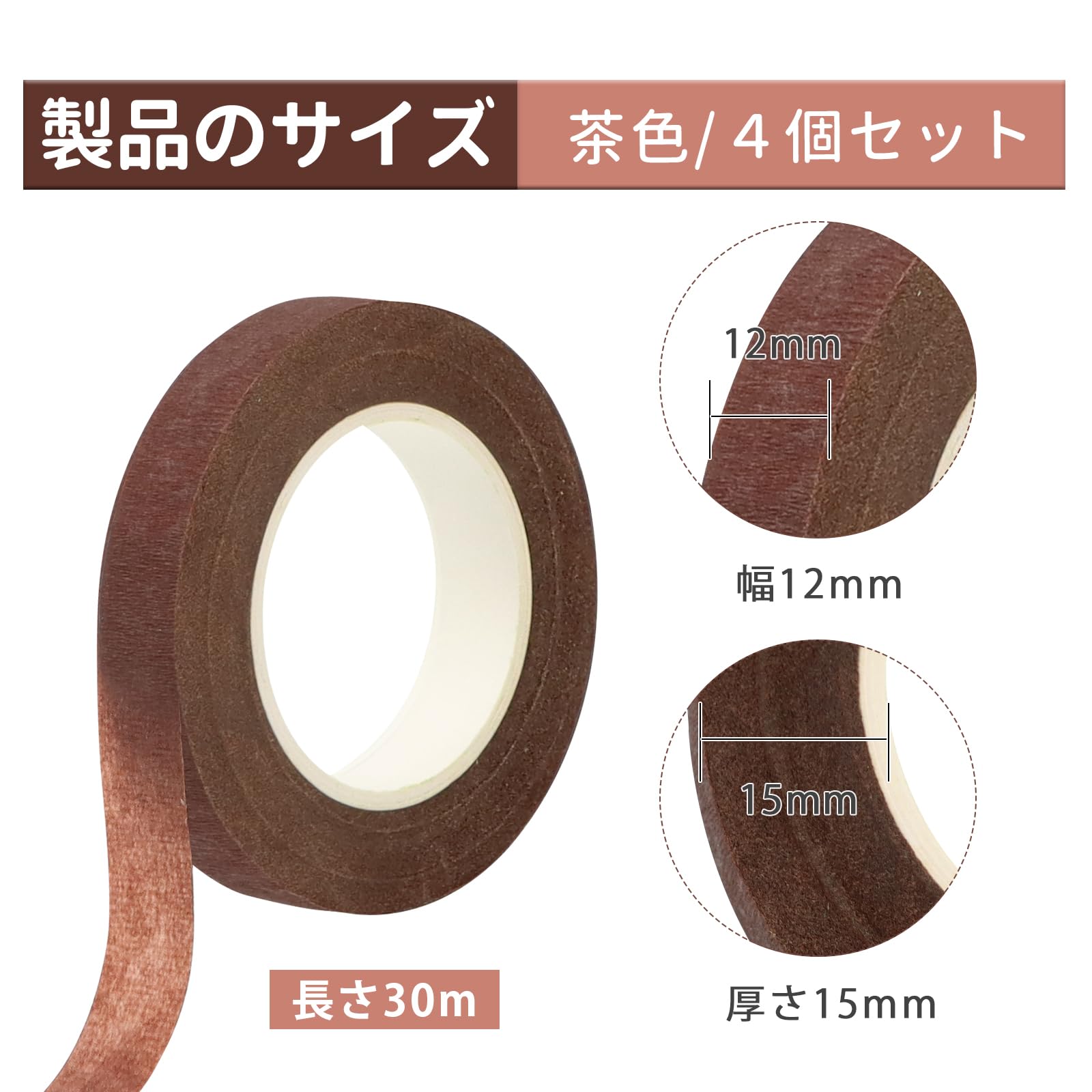 【製品のサイズ】色:茶色; テープのサイズ:長さ30m*幅さ12mm*厚さ15㎜;素材:紙;セット内容:フローラテープx4巻入