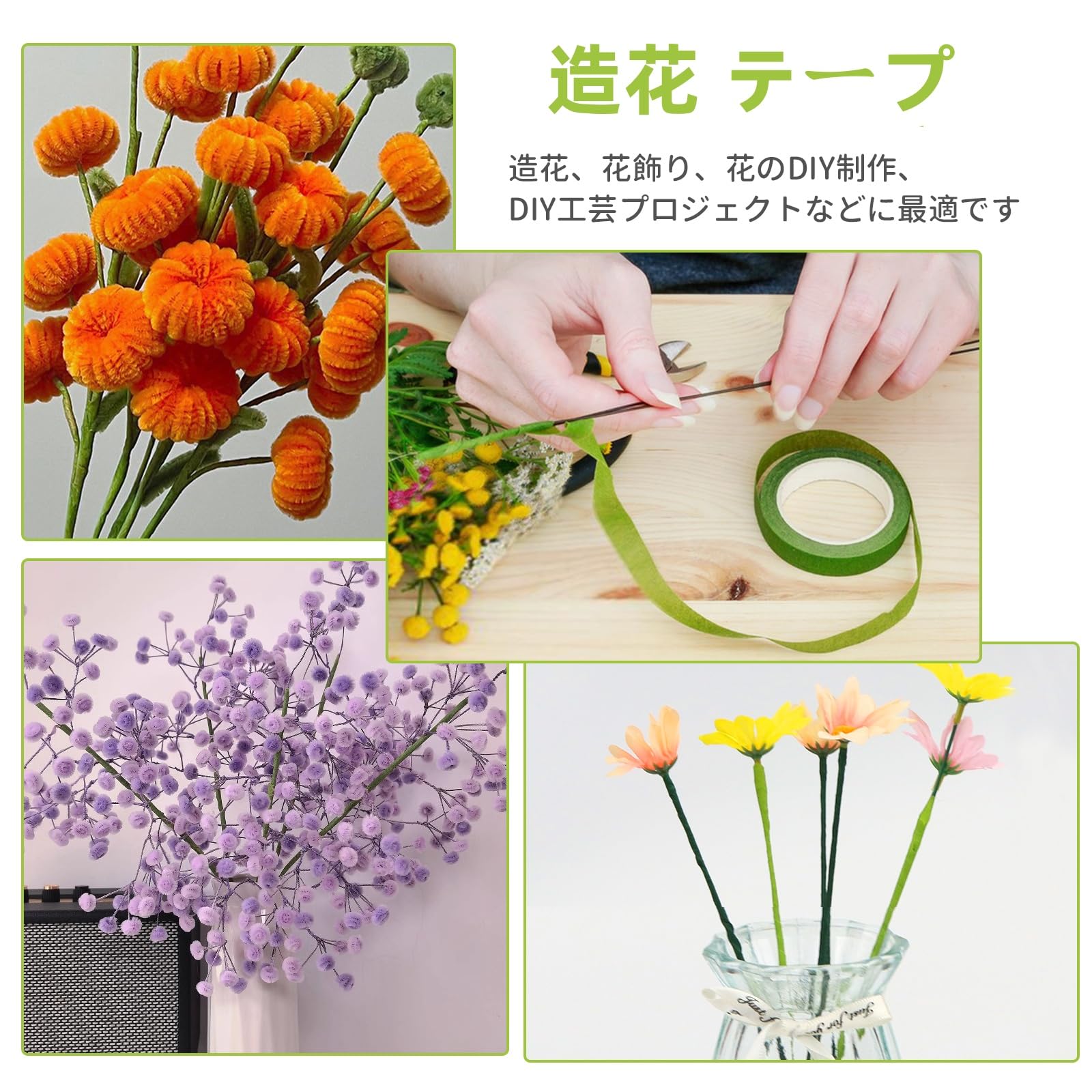 【造花テープ】花の茎や枝を巻くための専用テープです。フローラルテープは滑らかで柔軟な質感で、伸縮性と粘着性もがあり、簡単に巻くことができ、手で裂くこともできる。花や茎の花束、ブーケ、造花などに最適,花に自然で美しい外観を与えることができます。