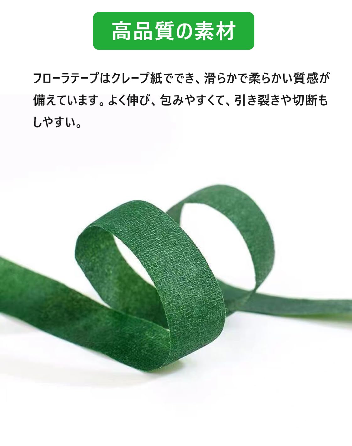 高品質の素材:フローラテープはクレープ紙ででき、滑らかで柔らかい質感が備えています。よく伸び、包みやすくて、引き裂きや切断もしやすい。造花の茎や花束のまとめに便利