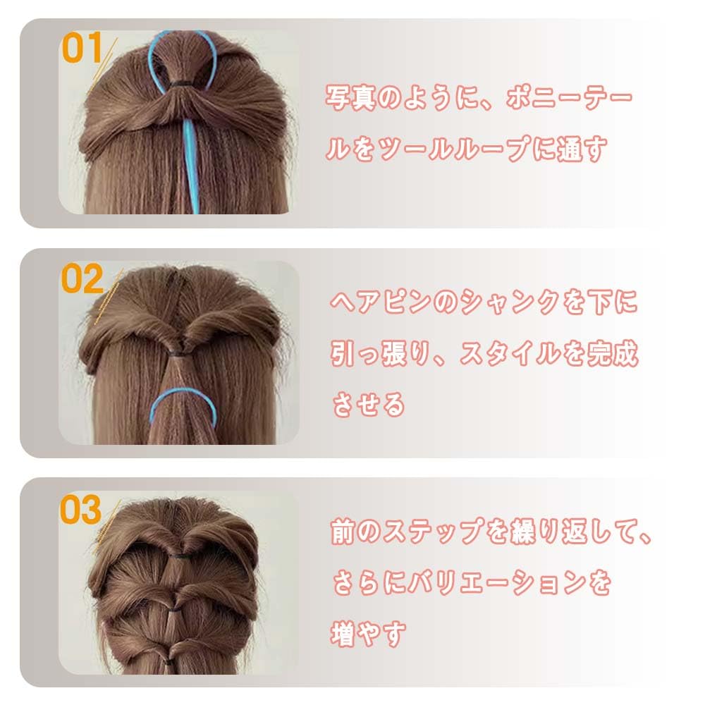 推奨利用シーン:あなたのさまざまなニーズを満たすさまざまな種類のヘアツールを含む。大きいサイズはヘアアレンジの定番、ゴム隠し、後ろ毛隠し、くるりんぱ、逆リンパ、などにおすすめ。小さいサイズは指で掴むことの出来ない少量の毛束や、細かいゴムの結び目に使うことで後ろ毛が残らずキレイにセットすることが出来ます。