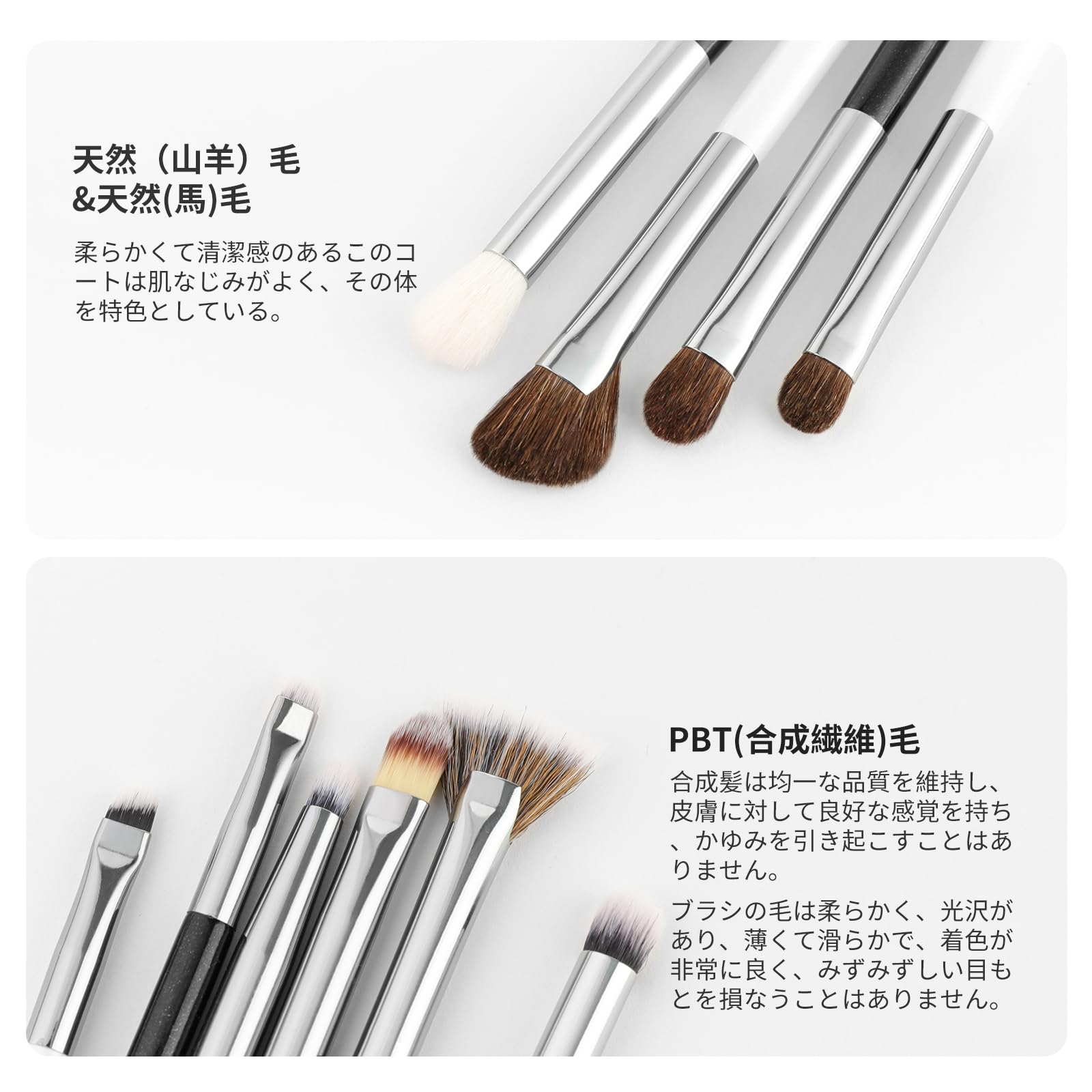 【ポニーの毛&山羊&高級タクロンを使用】「天然毛」の中で一番アイシャドウブラシに適しているのが、ポニーの毛です。柔らかくて弾力性に富んでおり、発色に優れていて繊細な目元を傷つけない。アイブロウブラシなどは、適度なこしが必要なため、柔らかいがこしがあってなおかつ耐久性のある高級タクロンを使用。