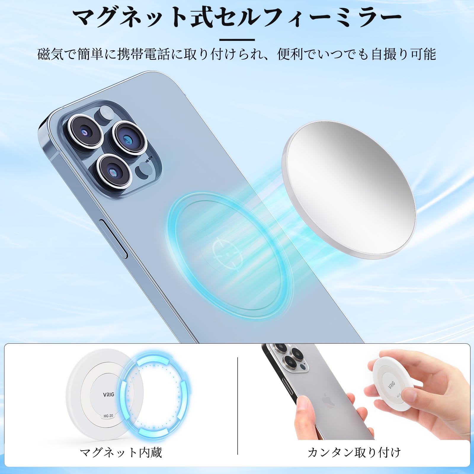 ?「磁力吸付、取り付けが簡単」マグセーフ技術を利用したVRIGセルフィーミラーは、簡単にiPhoneの背面に磁力で吸着します。これにより、ミラー越しに自分の姿を確認しながら、リアカメラで手軽に自撮りできるようになります。