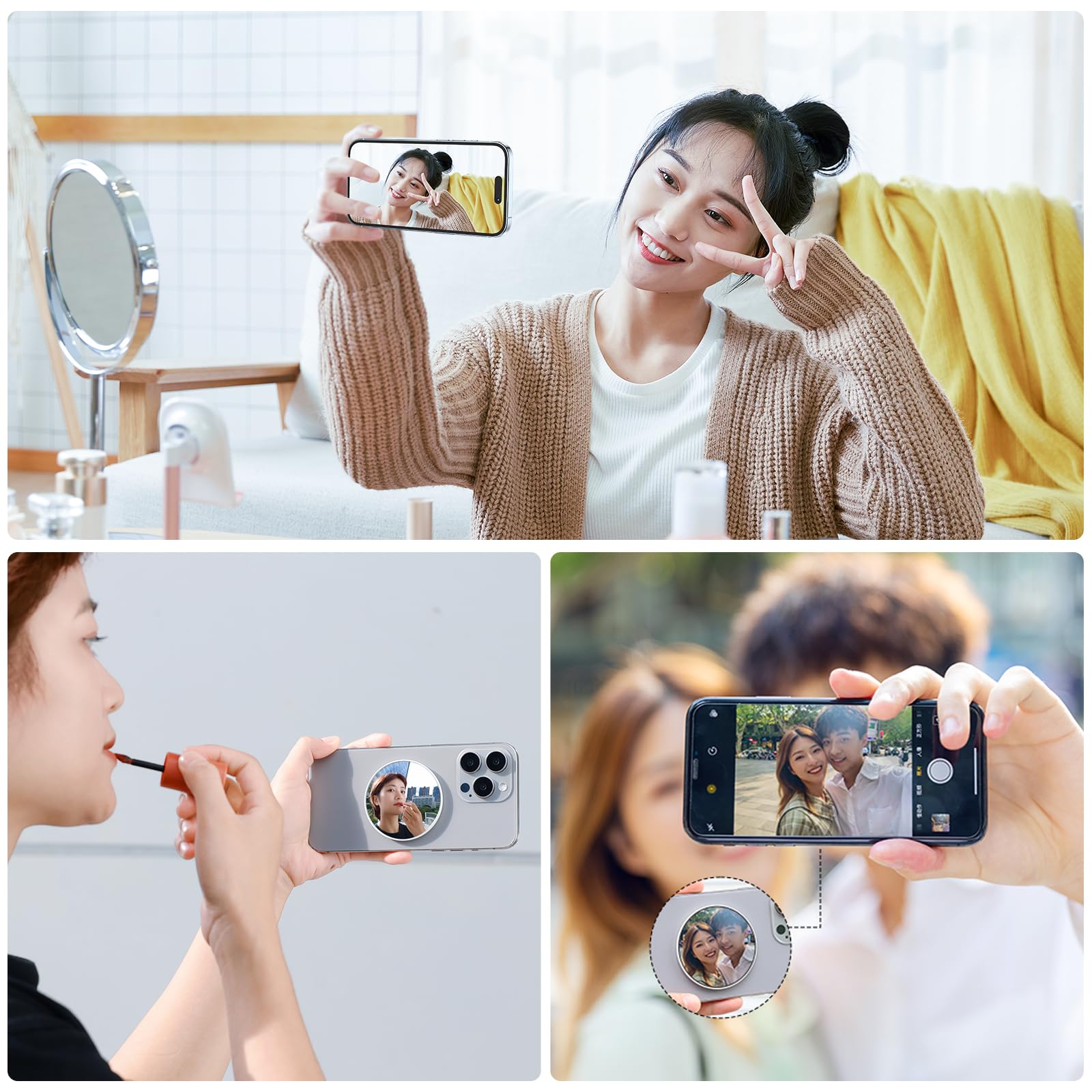?「リアカメラ用自撮りミラー」通常、携帯電話の背面カメラは前面カメラよりも高性能で、より鮮明な画像を撮影することができます。背面カメラを利用して自撮りするため、ミラーで自分を確認しながら写真でき、表情やポーズを丁寧に調整し、理想のセルフィーを撮影できます。