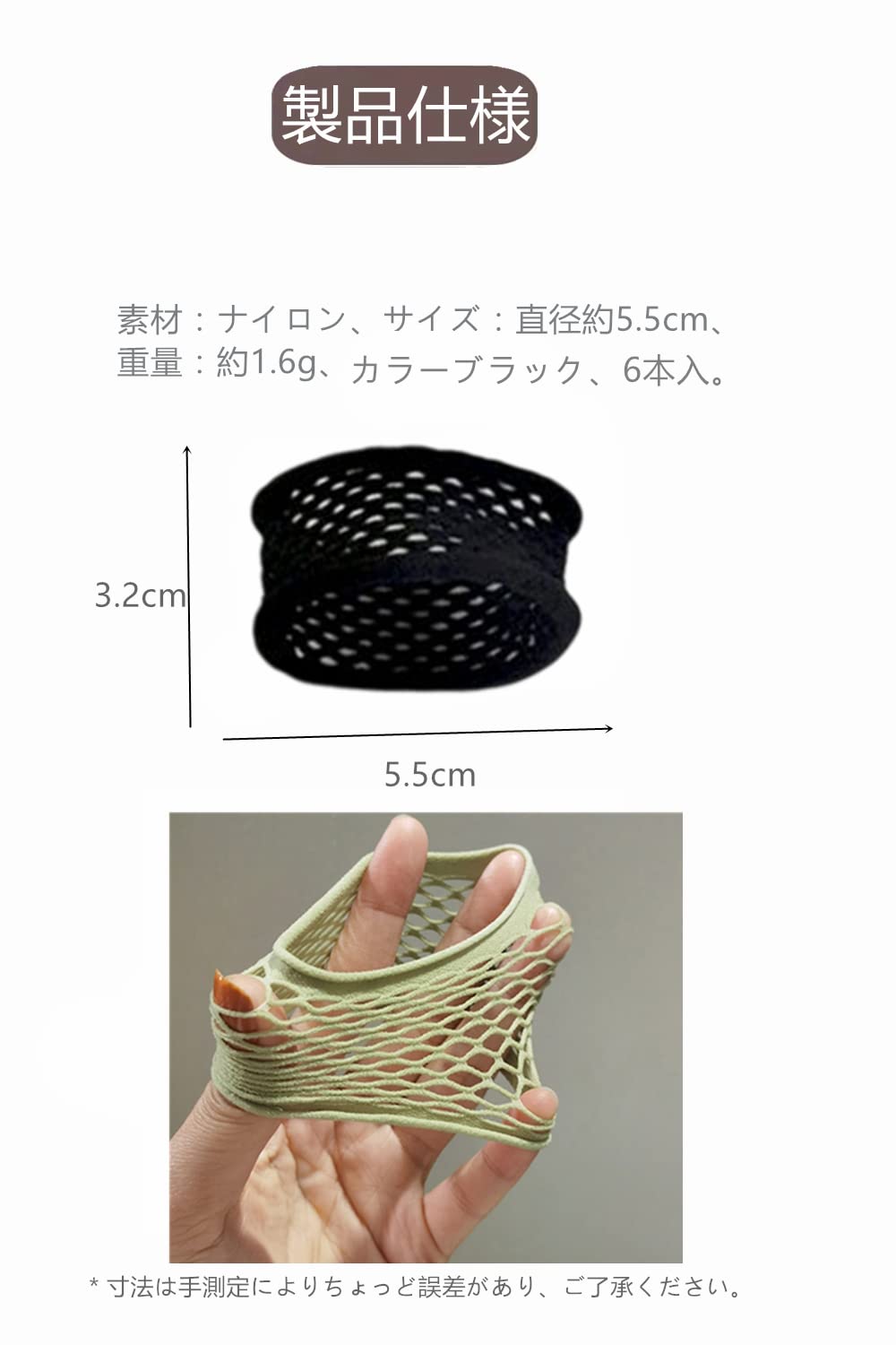 【サイズ】直径が約5.5cmのヘアゴムです。最大で20cmまで伸ばしてもしっかりと元に戻ることができます。そのまま着用してもヘアアクセサリー等の素材としても使えます。