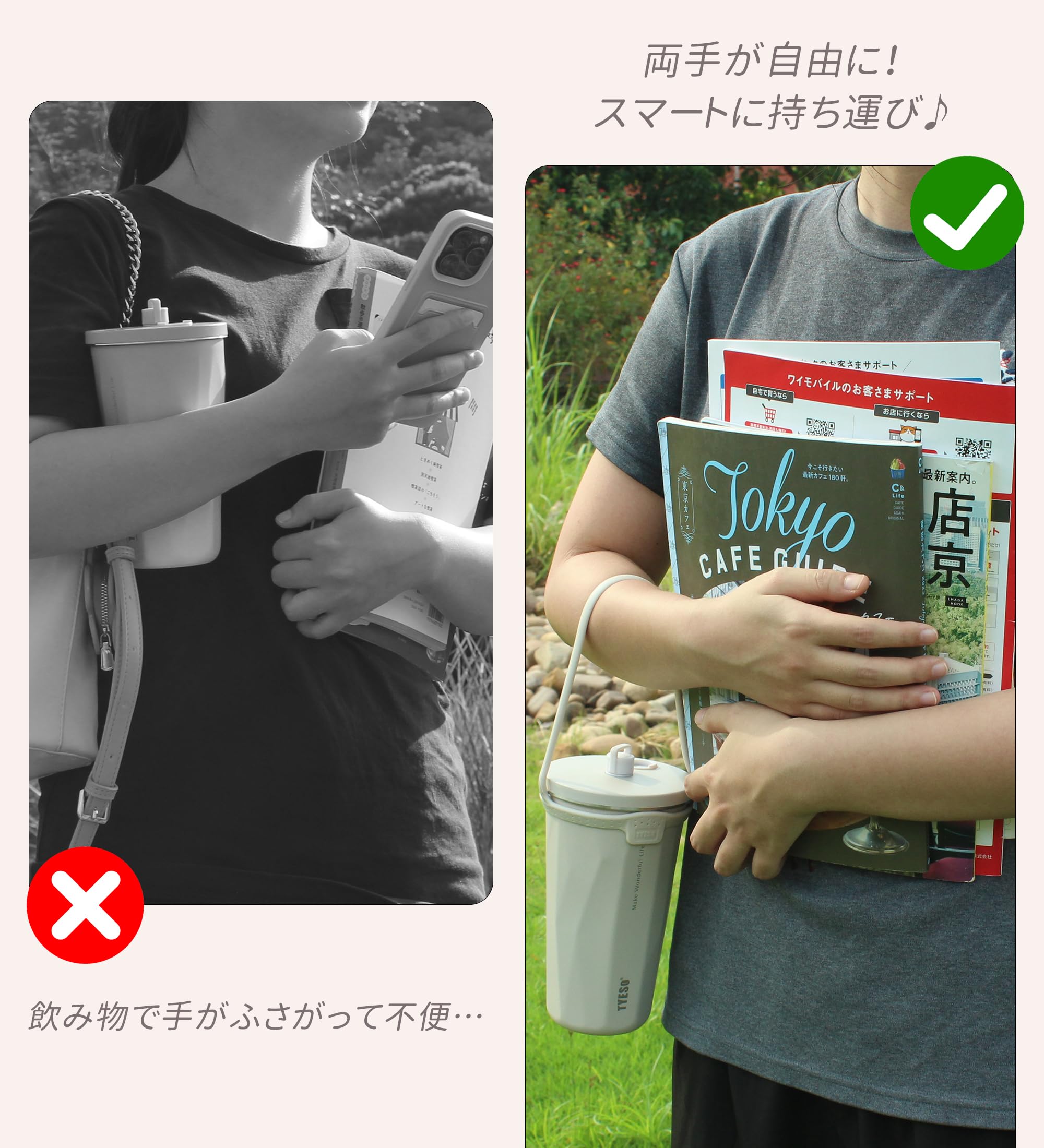 便利な持ち運び: 吊り下げ式でバランスを保ちやすく、熱い飲み物にも直接手を触れずに持ち運び可能。通勤・通学・買い物・サイクリング中でも、両手を自由にしてドリンクを楽しめます。