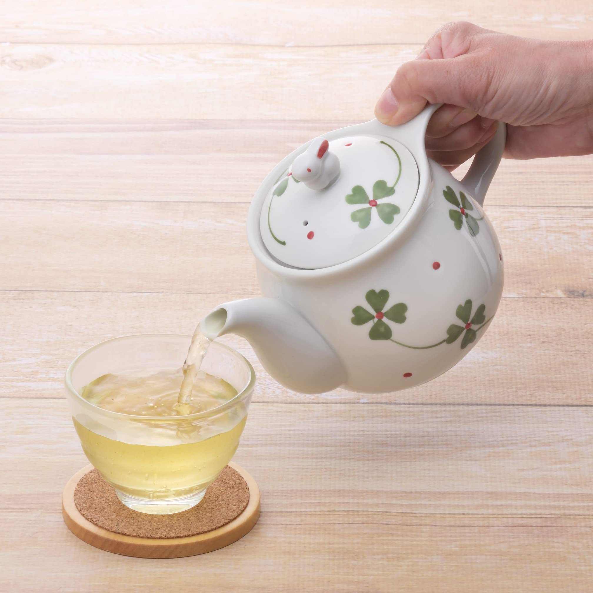 縁起の良い四つ葉のクローバーとうさぎで、癒しのひと時をお過ごし下さい。手描きでかかれた色鮮やかな四つ葉のクローバーです。つまみやすいうさぎが可愛らしいです。持ちやすい大きめの取っ手で使いやすいです。湯呑約3〜4杯分。湯?み以外は商品ではありません。