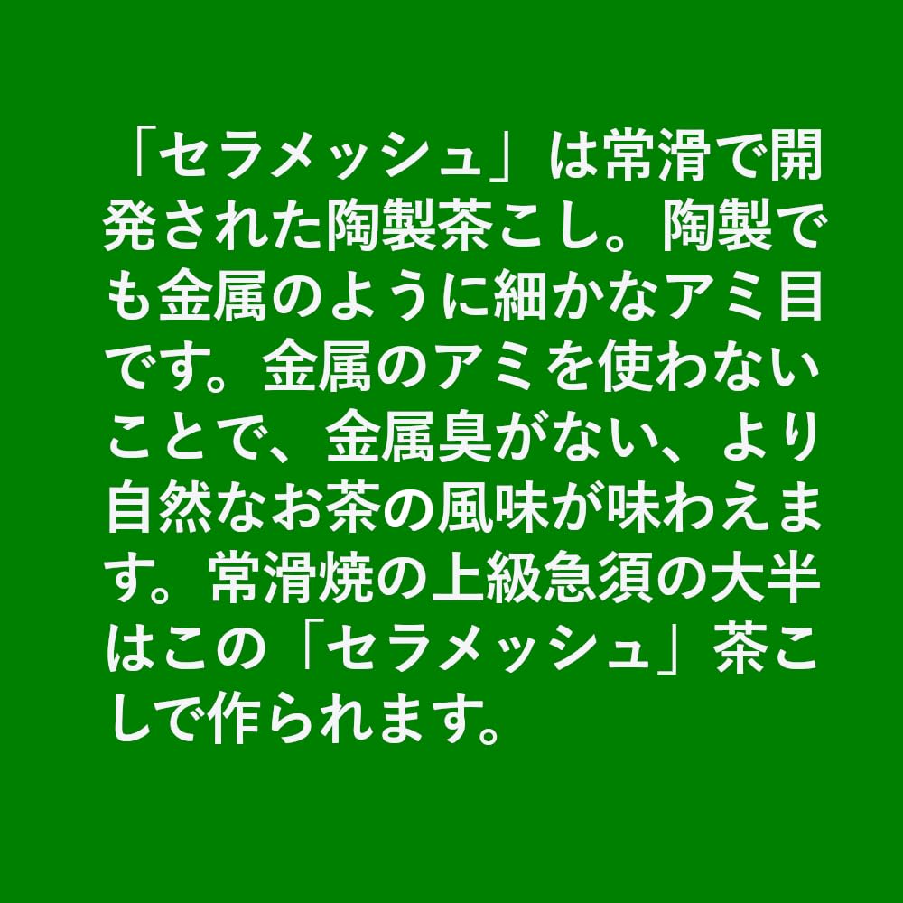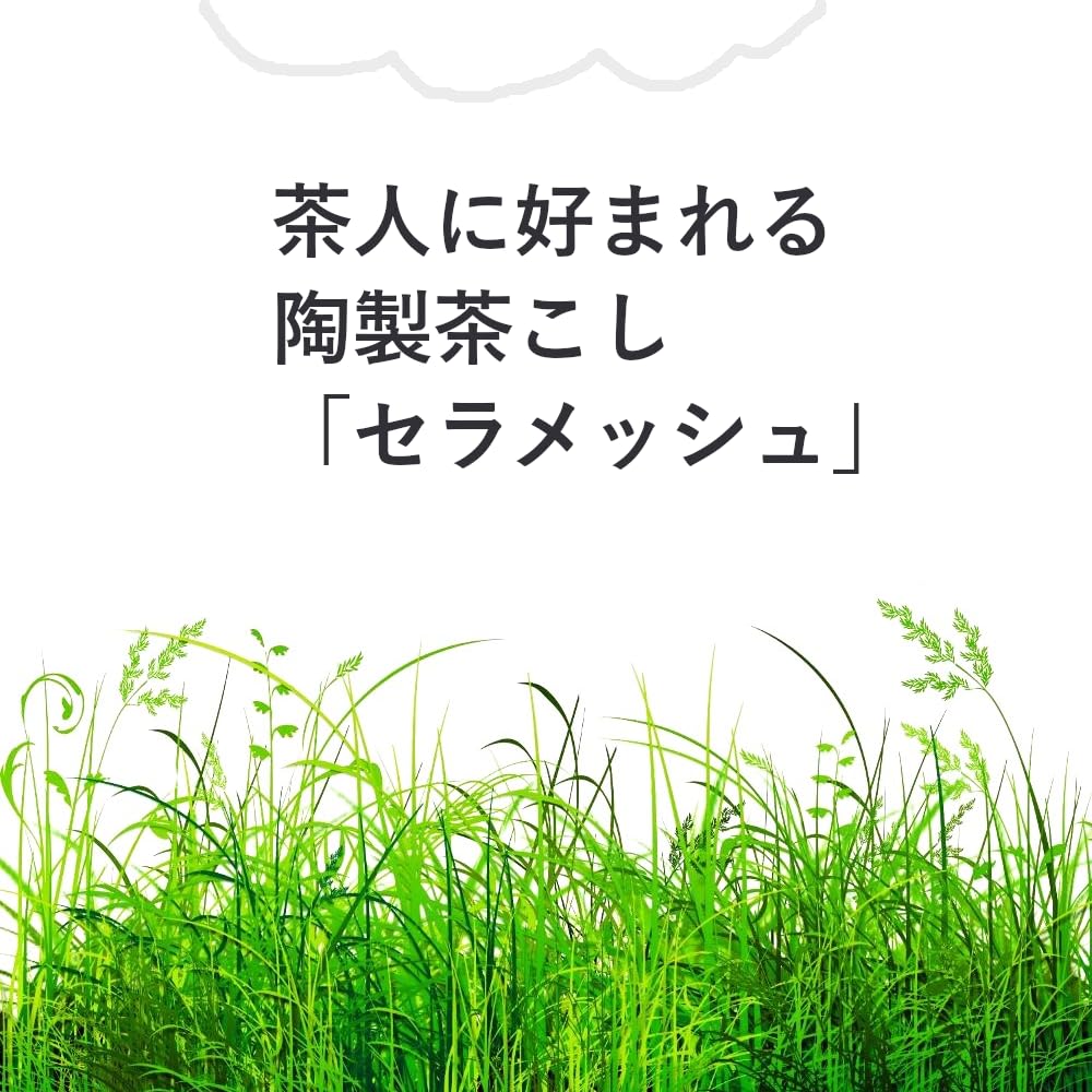 陶製茶こし「セラメッシュ」は金属の茶こしに頼らずに、昔からの焼き物の茶器にこだわってお茶本来の自然な味を楽しむために開発されました。茶葉の種類によっては目詰(づ)まりしたり、細かな茶葉のかけらがお茶に混じることがあります。流れ出た茶葉はそのまま食してかまいませんが、より「茶こし機能」を優先される場合は「ステンレス製茶こし付き」急須をお選びください。
