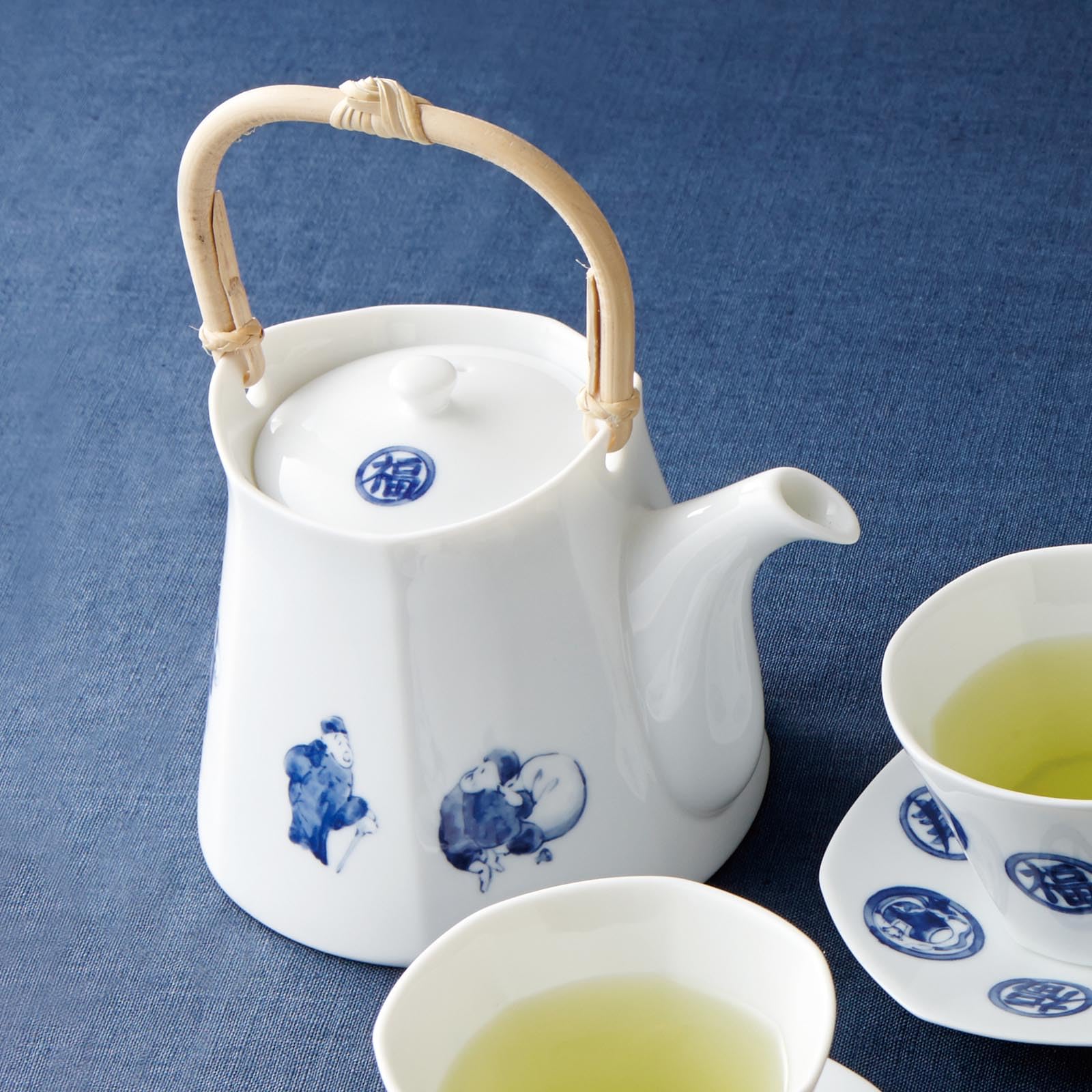七角形の白磁の茶器に染付で描かれた七福神。その愛らしい姿で思わず頬がゆるむお茶の器です。