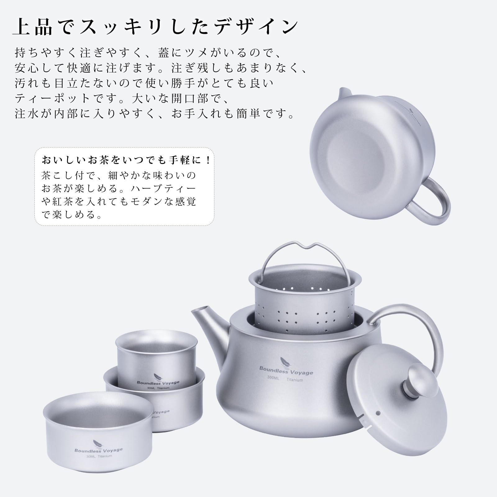 Boundless Voyage チタン急須湯呑みセットティーポット 茶こし付き おしゃれ かわいい シンプル 300ml 2~3杯用 急須 直火 耐熱 軽量 サビない 茶具 お茶 ポット お家 事務所 持ち運びに便利 茶器 旅行ティーセット 割れない 急須 アウトドア キャンプ用品 収納袋付き (チタン急須湯呑みセット)Ti3119D