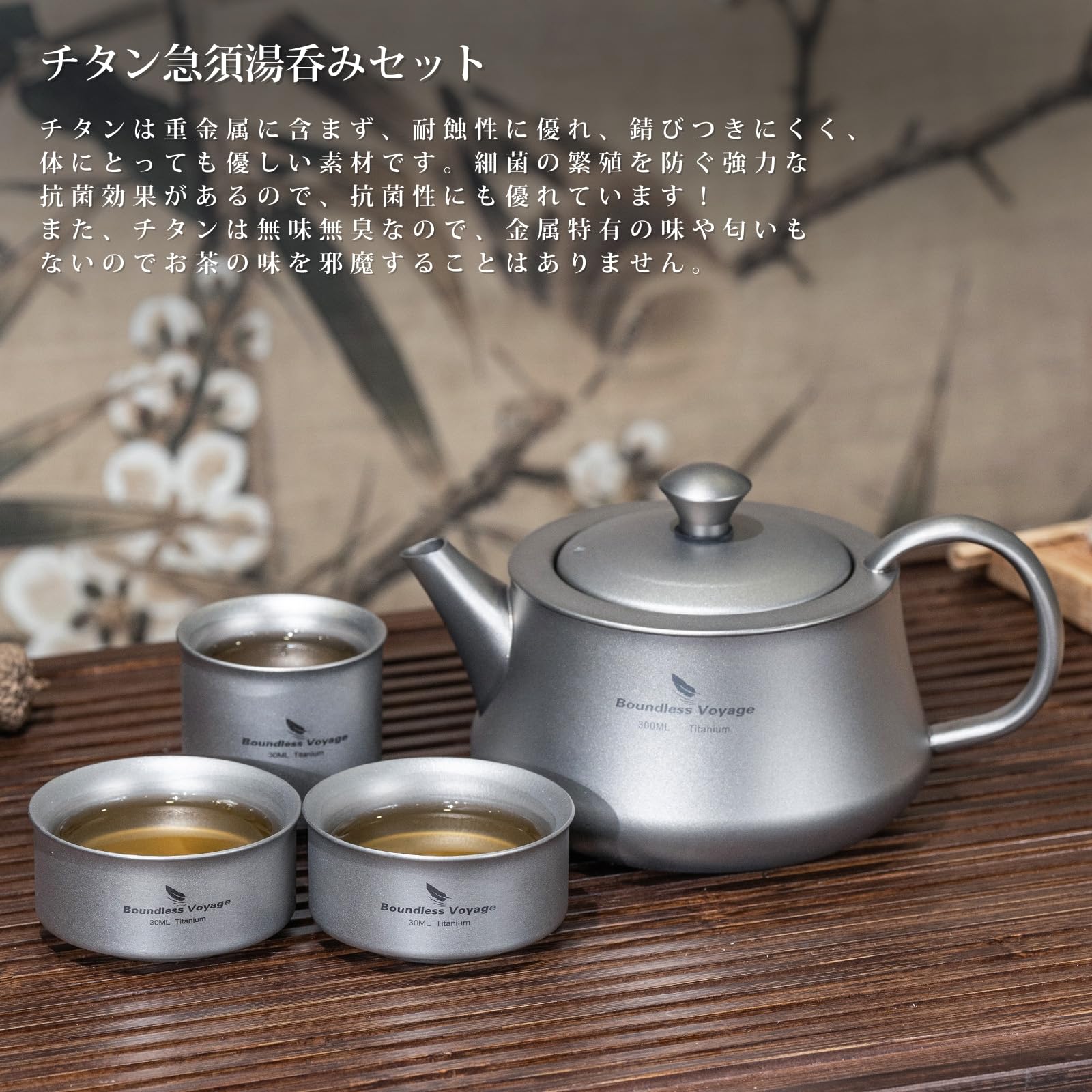 【チタン急須湯呑みセット】:チタンは重金属に含まず、耐蝕性に優れ、錆びつきにくく、体と環境にとっても優しい素材です。細菌の繁殖を防ぐ強力な抗菌効果があるので、抗菌性にも優れています!また、チタンは無味無臭なので、金属臭を感じづらく、お茶の味を邪魔することはありません。