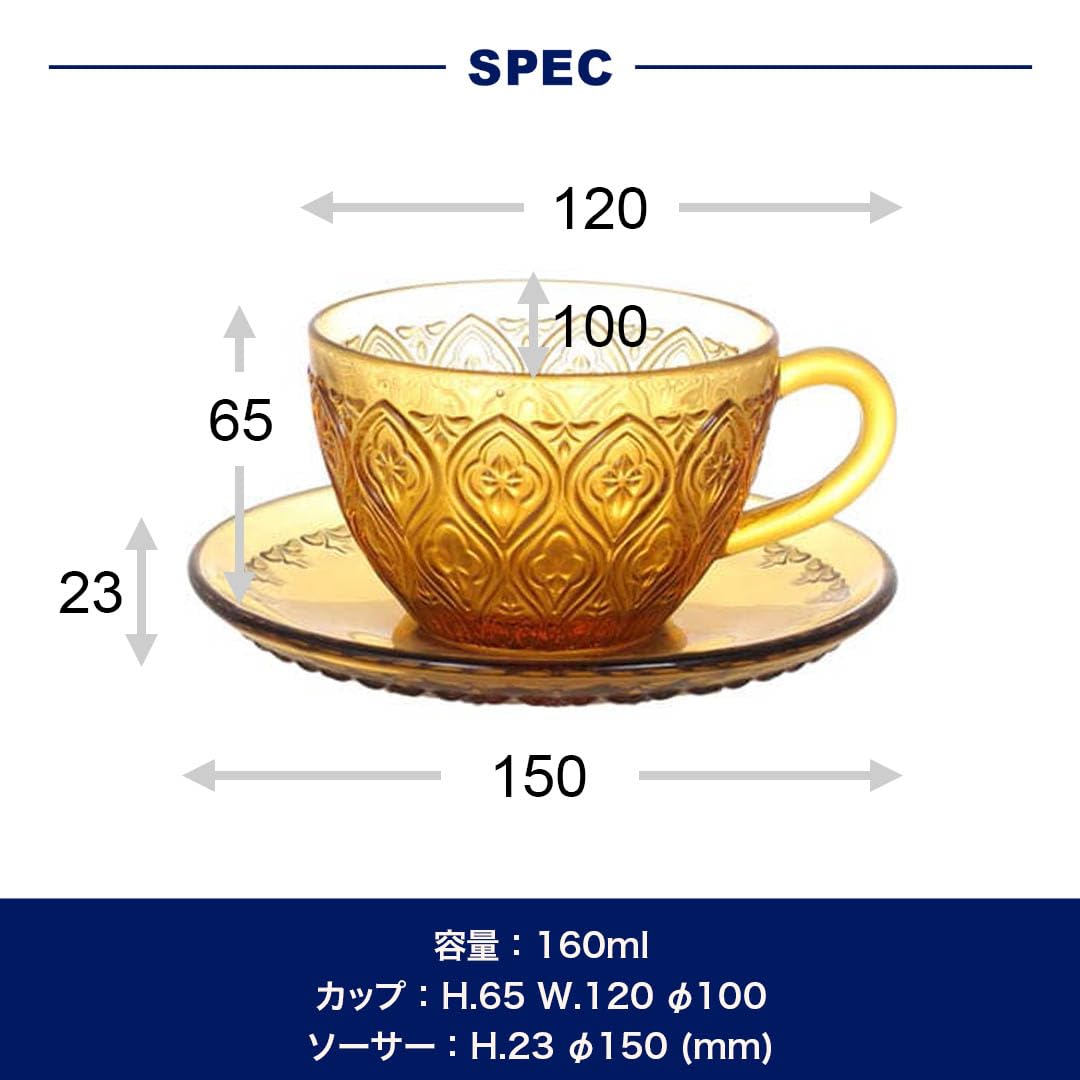 サイズ : カップ : 高さ65×幅120mm、直径100mm、ソーサー : 高さ23mm、直径150mm・容量 : 160ml