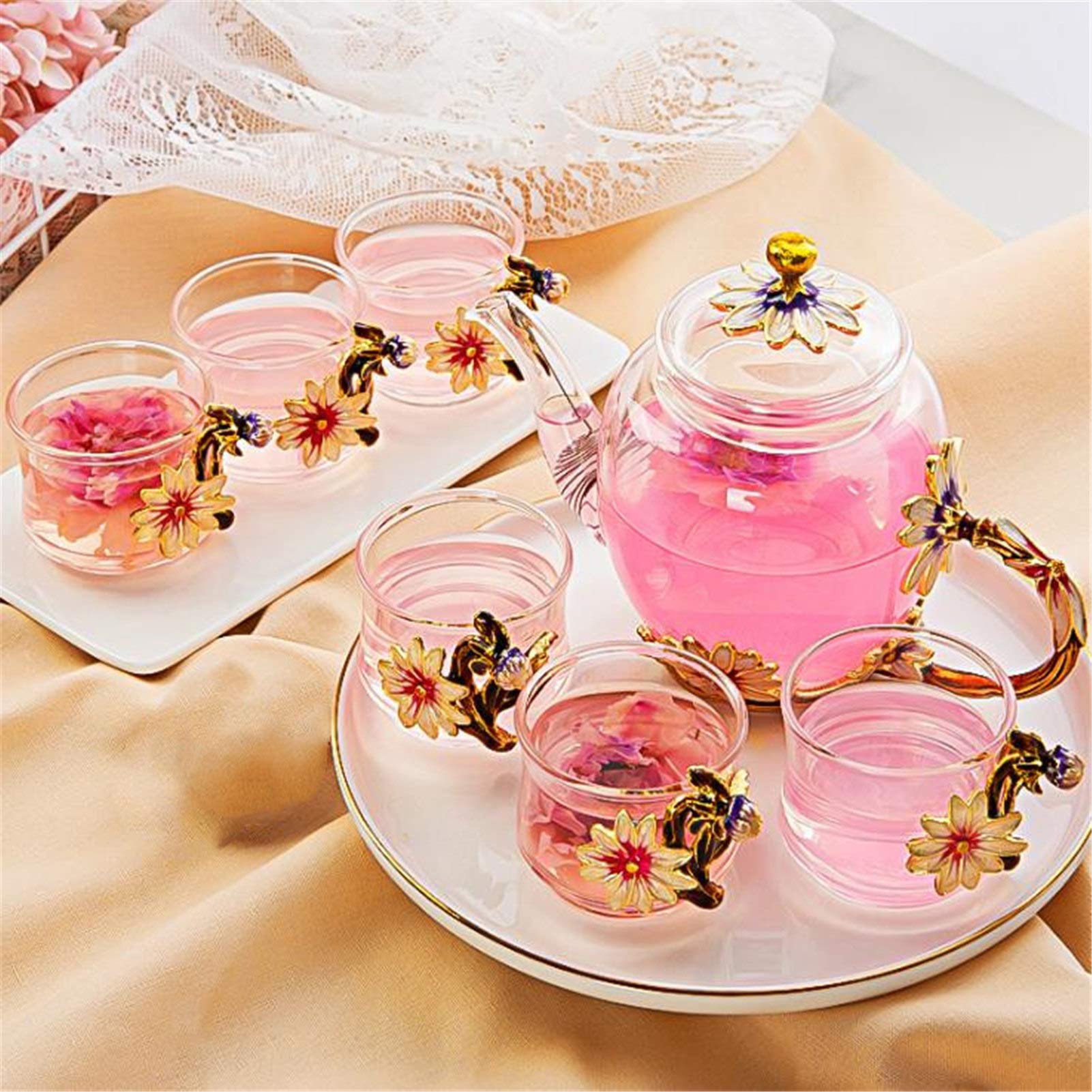 ティーポット 耐熱ガラス 菊 ティーカップ 7点セット 母の日 おしゃれ 急須 湯呑み 茶ポット 透明 保温 インテリア ハーブティーポット 工芸茶 コーヒーカップ 厚手 真空断熱 紅茶 花茶 緑茶 ティーパック プレゼント