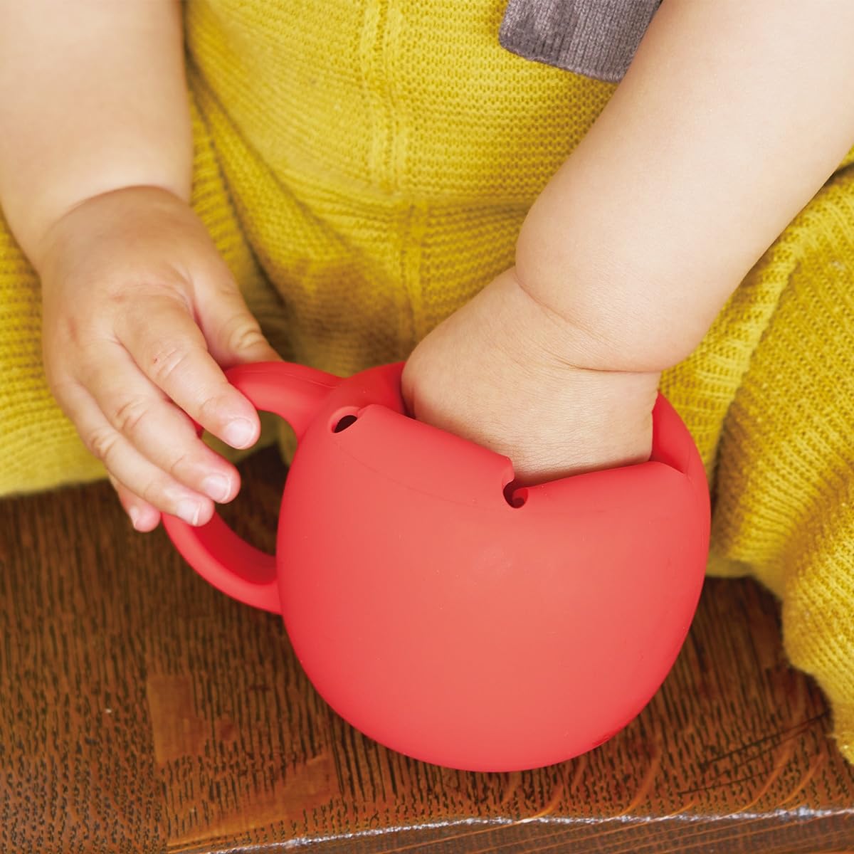 食べ過ぎないから親子で安心。おやつはこどもにとって大切な食事のひとつ。食べるものもつかむのもまだまだトレーニング中だから、楽しんで覚えたい!倒れてもこぼれにくく、口が上に向きやすいように考えられた形状はかわいいだけではありません。コロンとしたキャッチーな見た目で、お出かけ時にもおすすめです。