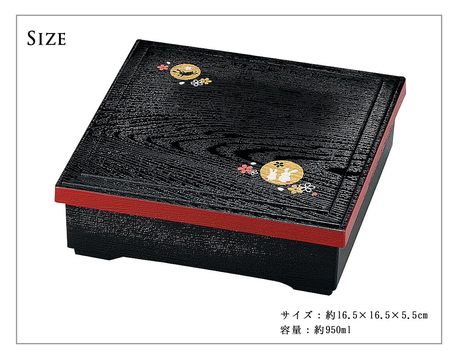 宮本産業 重箱 一彩一重 5.5 寸 月うさぎ 950ml 本体サイズ:約16.5×16.5×5.5cm 素材・材質:ABS樹脂 原産国:日本 電子レンジ対応:不可 電子レンジ対応:不可 食器洗い機対応:不可 容量:950ml ●月とうさぎが描かれた可愛らしい一重の器です。 ●和のおもてなしを感じさせてくれます。 ●行楽弁当やおせち料理など、特別の日の食卓を華やかに演出します。 ●レンジ・食器洗い機はお使いになれません。 ●安心の品質、日本製です。