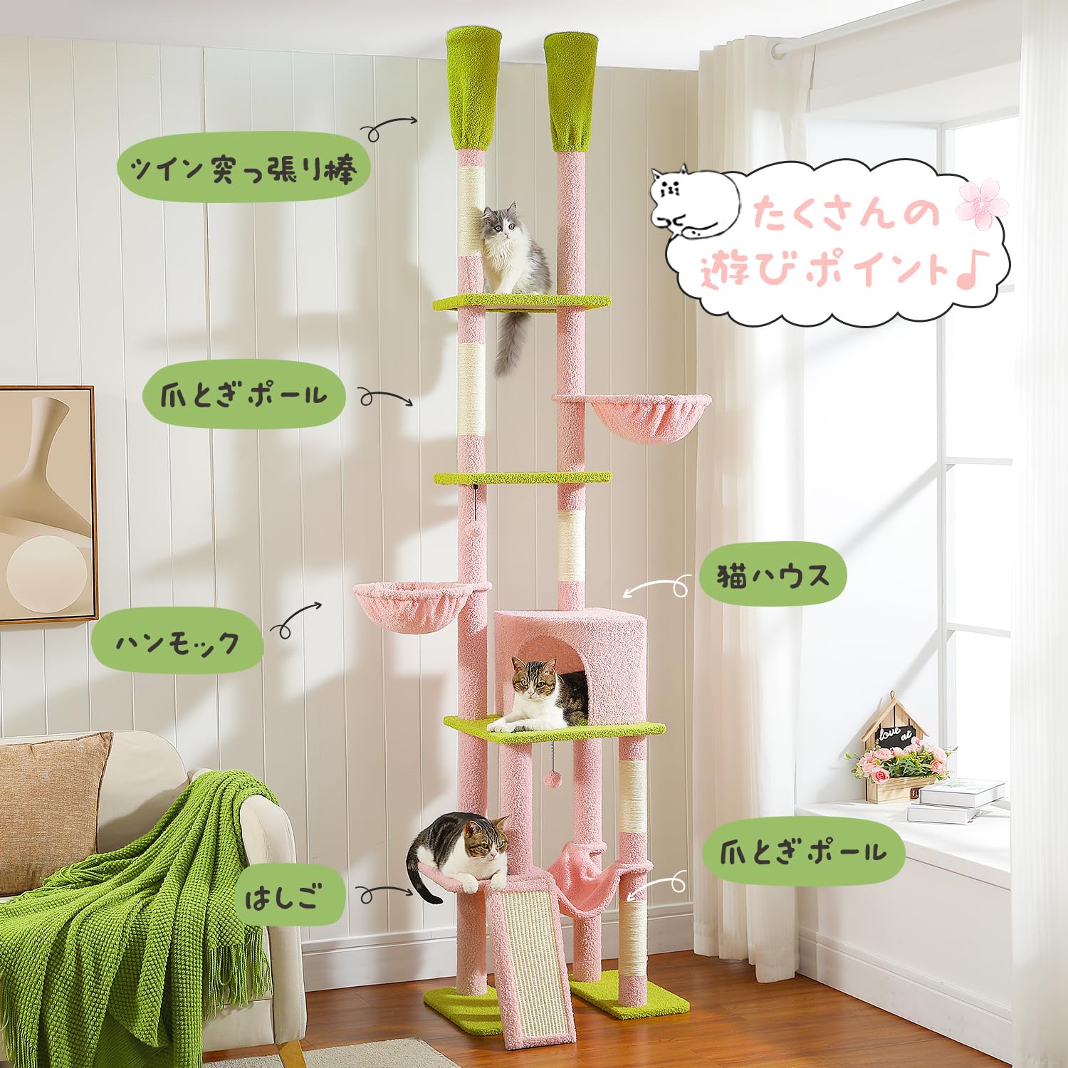 PETEPELA(ぺテぺラ) キャットタワー 突っ張り スリム 多頭飼い お花 つっぱり ハンモック 爪研ぎ つめとぎ 省スペース 運動不足解消 おもちゃ カラフル かわいい - ピンク 高さ調整幅216〜285cm