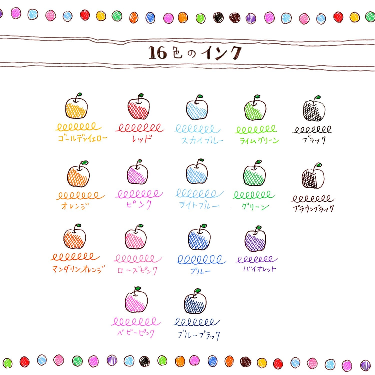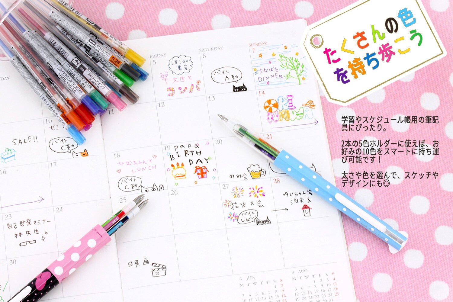 ホルダーは単色・3色・5色、リフィルはゲルインクがボール径0.28mm・0.38mm・0.5mmでそれぞれ16色。