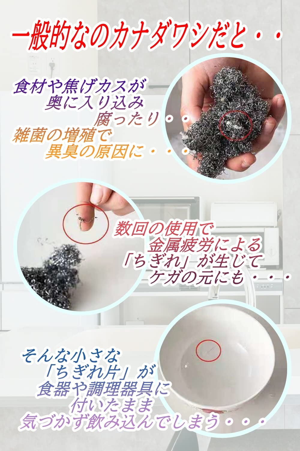 細かく解れる事が無いので、金属片によるケガ、食器への付着なども起こり難く安心
