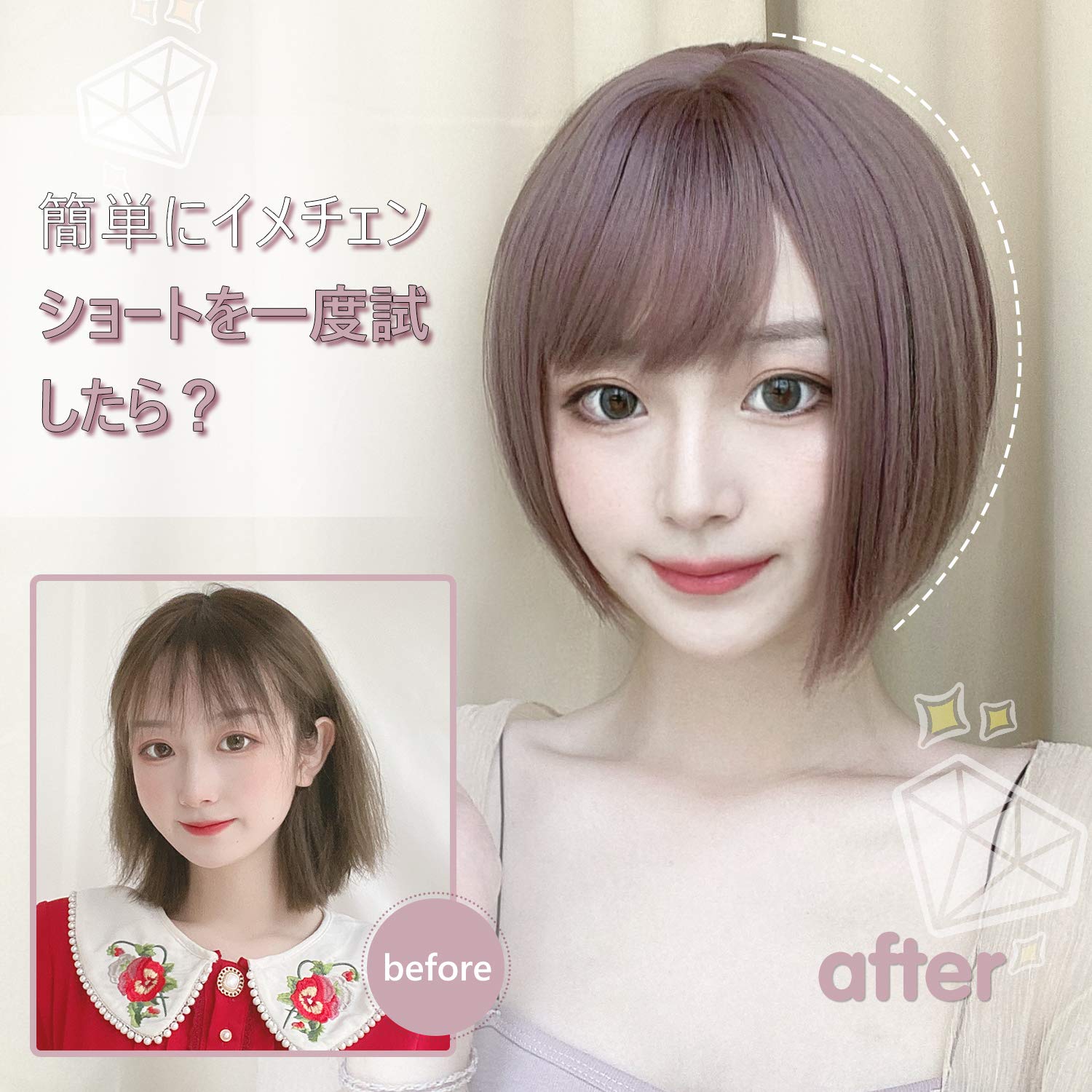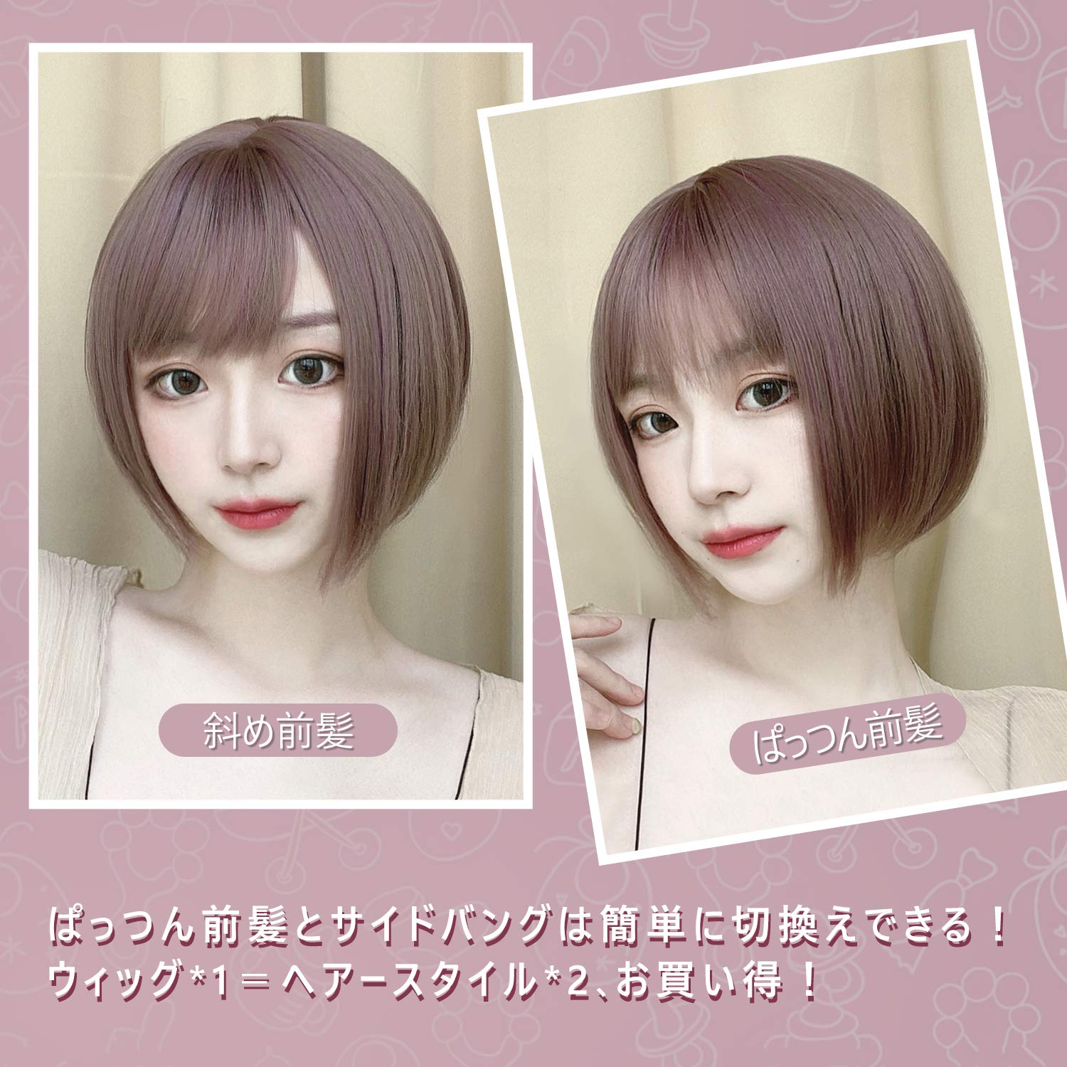 FESHFEN ウィッグ ショート ボブ サイドバング 斜めバング レディース 普段使い ナチュラル 女性用 女装 フルウィッグ 自然 かつら wig ネット付き 藤色