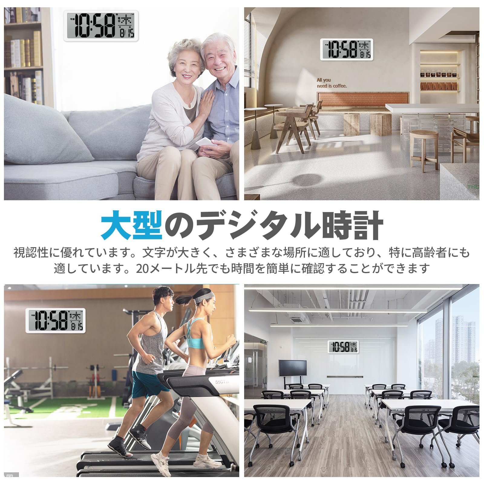 【多機能・大型デジタル時計】サイズ:36×15×3.5cmの超大型デジタル時計。主な機能:① 電波受信機能、② 目覚まし時計、③ 2段階調光、④ 自動光感応機能、⑤ 全視角表示、⑥ 日付/温度サイクル表示、⑦ ?/℃切替、⑧ 12/24時間表示切替、⑨ 記憶機能、⑩ スヌーズ機能、⑪ 一括停止機能、⑫ 壁掛け/卓上設置可能、⑬ 正転・逆転タイマー。