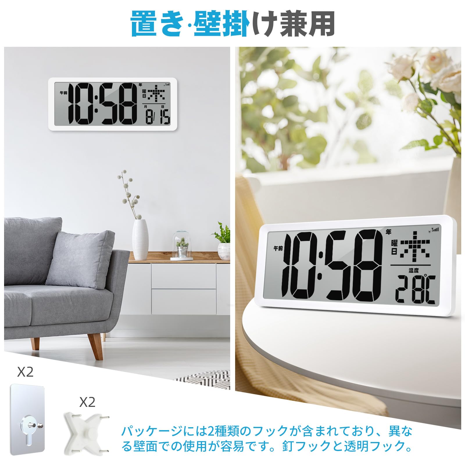 デジタル電波時計 LCD掛け時計 大画面 クロック 老人向け: 自動時刻合わせ 温度表示(℃/?) 日付・曜日表示 12H/24H表示 目覚まし時計 大音量 アラーム スヌーズ機能 メモリー機能 日本語説明書付き壁掛け・卓上兼用 36x15x3.5 cm(ホワイト)