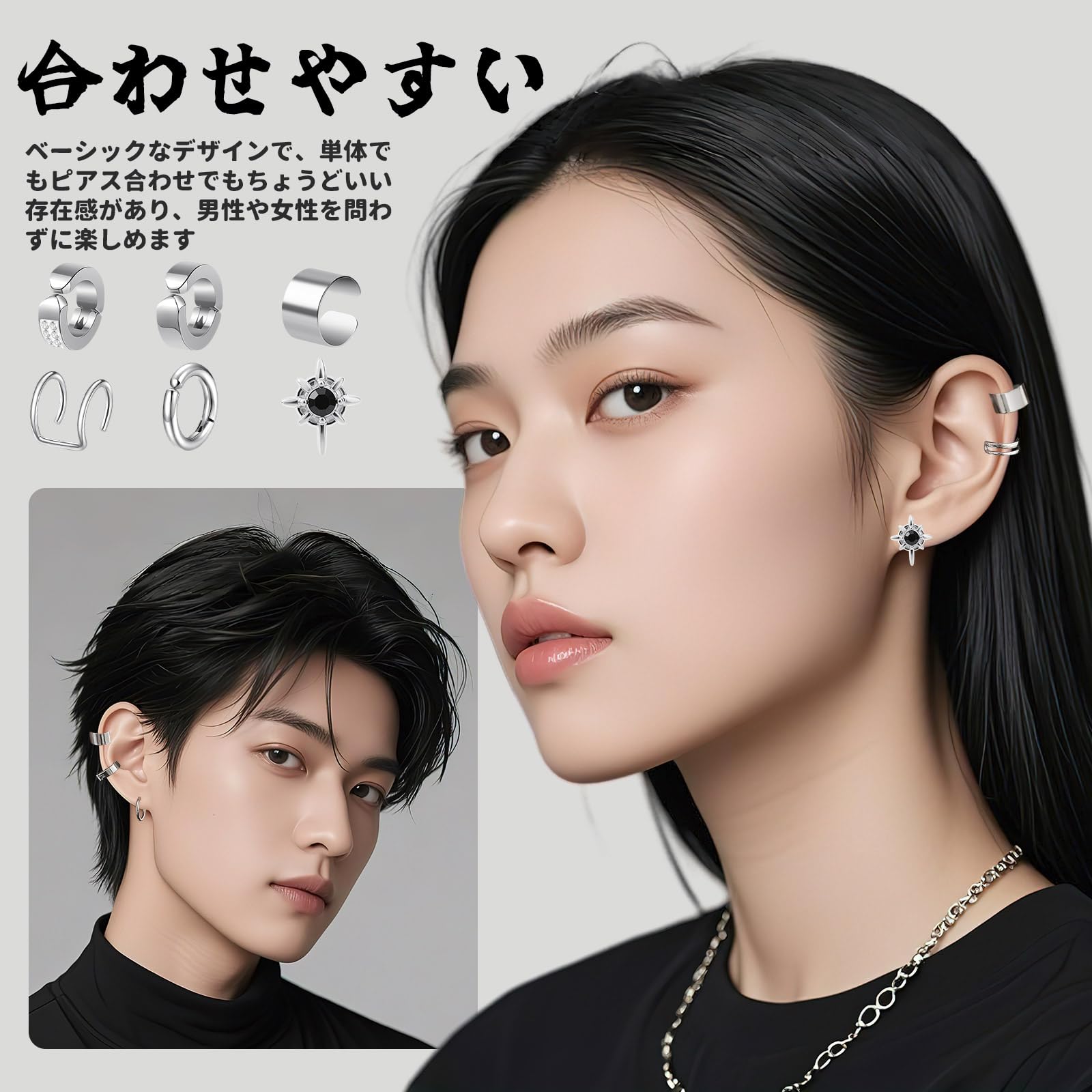 製品内容:パッケージにはノンホールピアス6個あり、デザインは多様です。耳たぶ用4個、軟骨用イヤリング2個、そのうちにマグネット式イヤリング1個があります。豊かな選択から、さまざまな場面、服装、気分に合わせてイヤリング イヤーカフを変え、個性を現わします