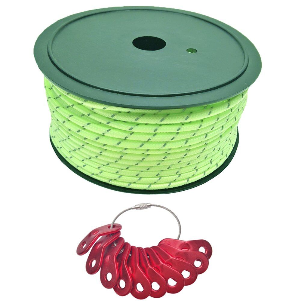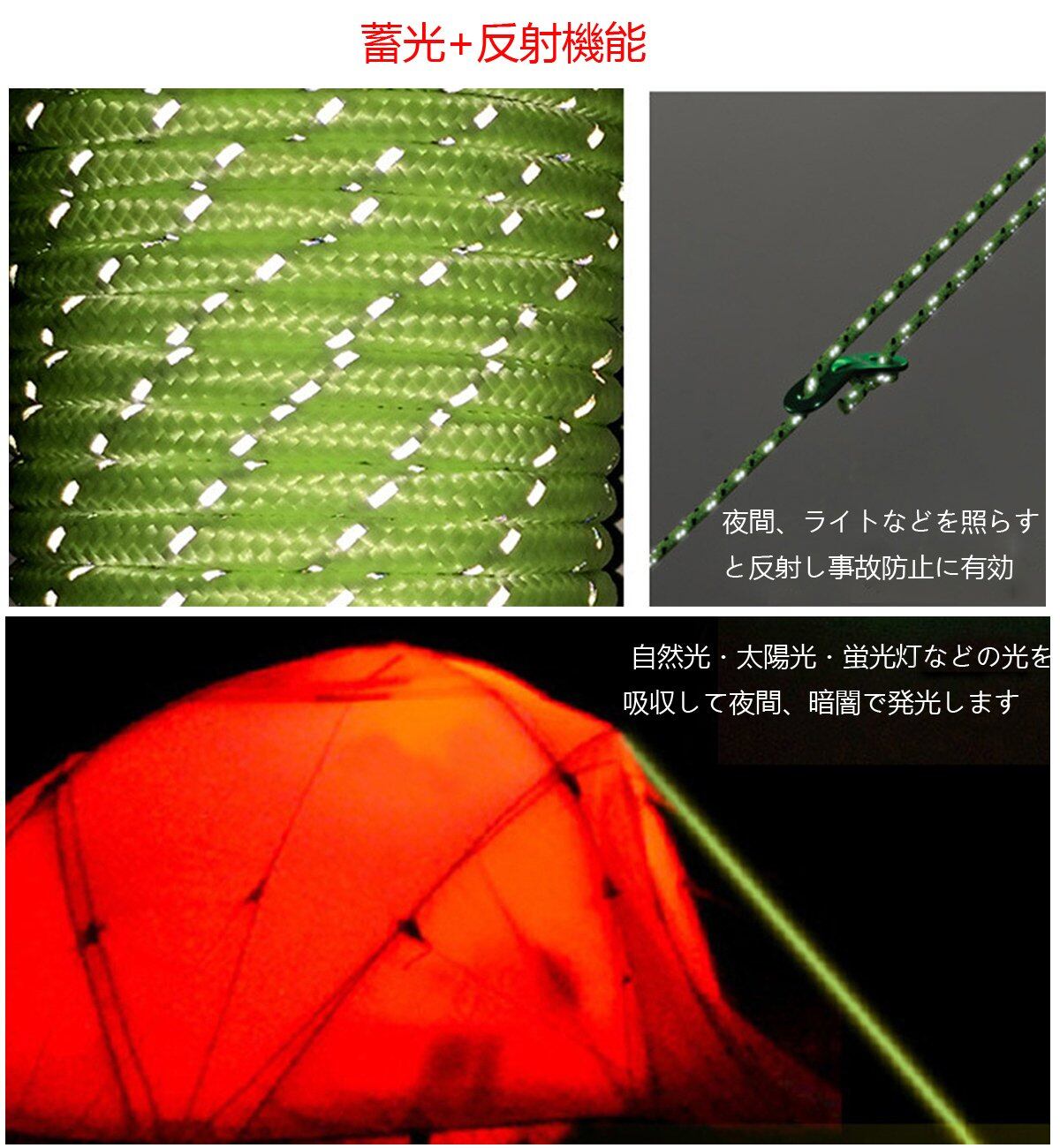 Cheerly キャンプ テントロープ 50m 4mm反射/ 5mm蓄光+反射 高視認性 ガイロープ アルミ自在金具 10個 アウトドア 用