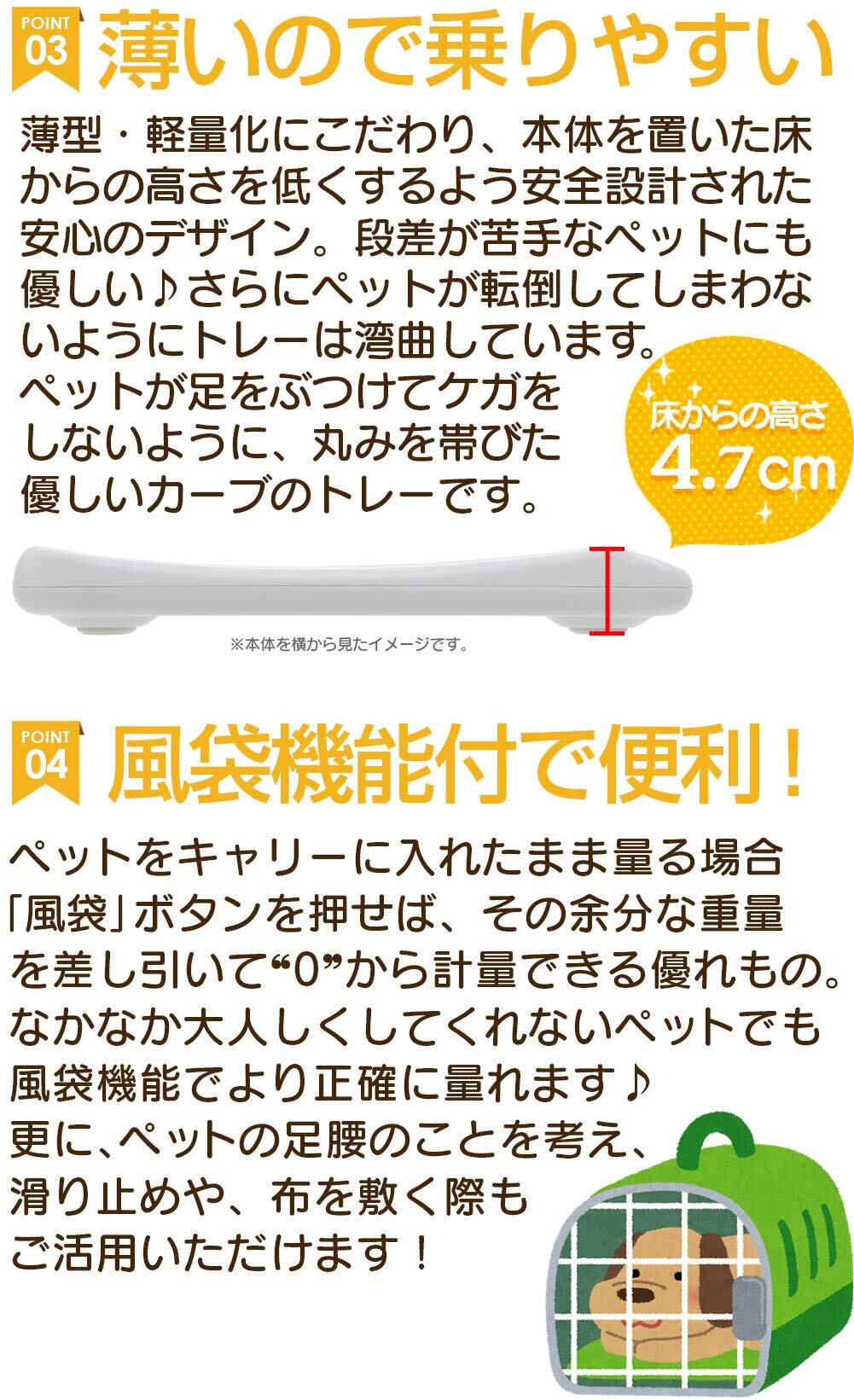 【足腰に優しい薄型・キャリーのまま量れる風袋機能付き】薄い設計なので段差が苦手なペットにも優しい♪薄型・軽量化にこだわり、本体を置いた床からの高さを低くするよう安全設計された安心のデザイン。段差が苦手なペットにも優しい♪さらにペットが転倒してしまわないようにトレーは湾曲していて安全です。床に置いてもペットが足をぶつけて怪我をしないように、丸みを帯びたやさしいカーブのトレーに仕上げました。