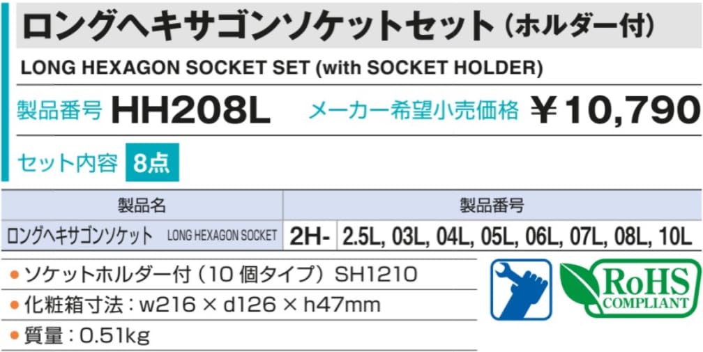 セット内容:ロングへキサゴンソケット2H-2.5L、03L、04L、05L、06L、07L、08L、10L