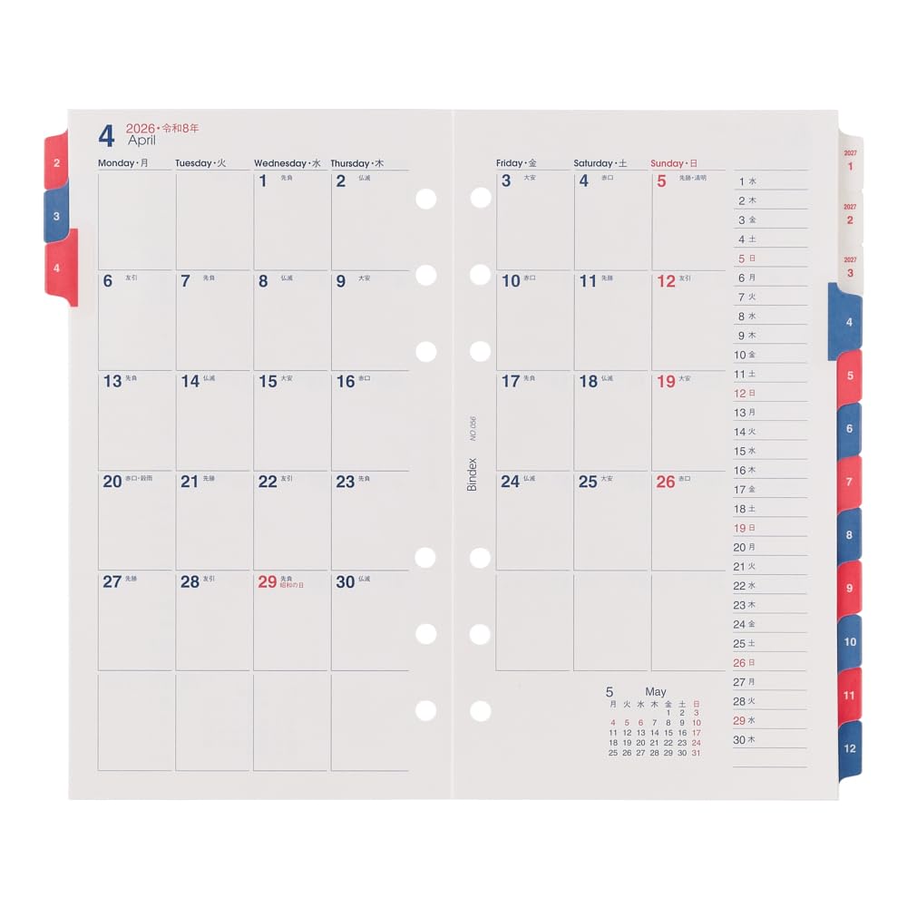【新着特価】能率 バインデックス システム手帳 リフィル 6穴 2026年 バイブル マンスリー カレンダータイプ インデックス付 056 (2025年 12月始まり)