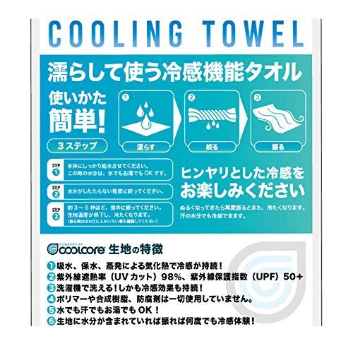 ??驚きのひんやり感!! 米国特許取得の冷感機能素材を使用した 『 POWERED BY COOL CORE 』クールコアタオル 独自開発の繊維により気化熱を効率的に発生させ、 即効性のある冷感を楽しんでいただけます。