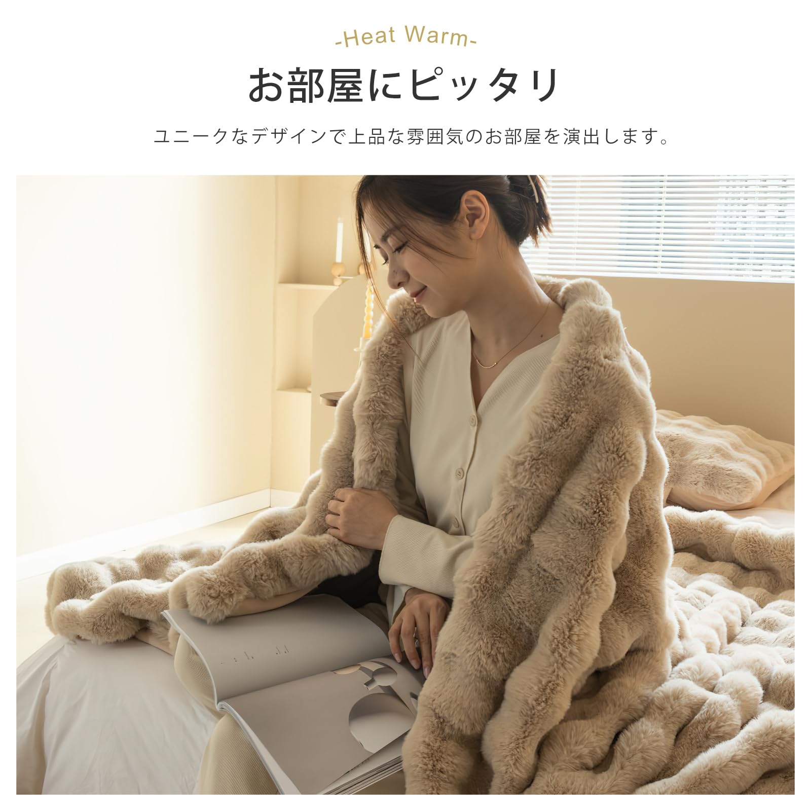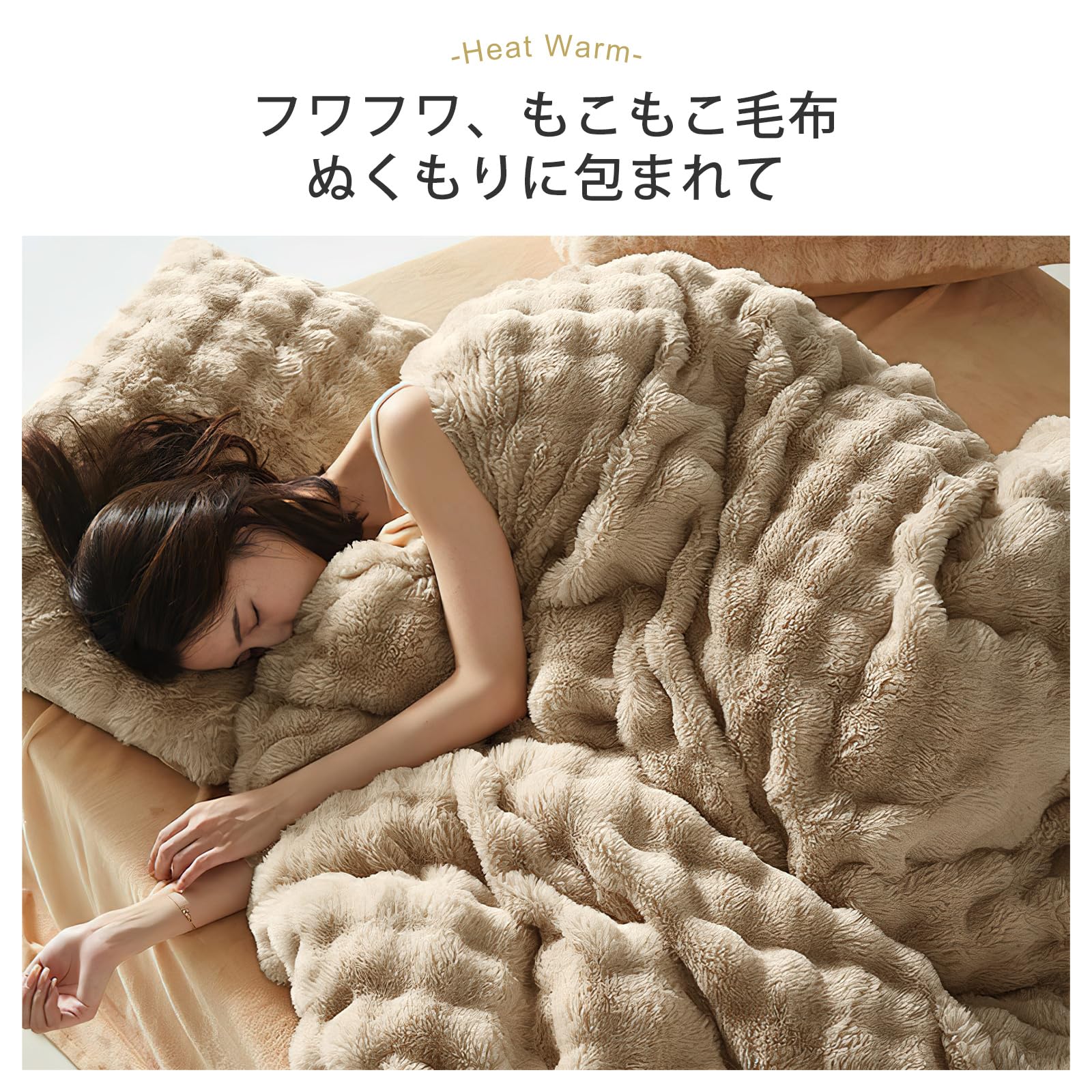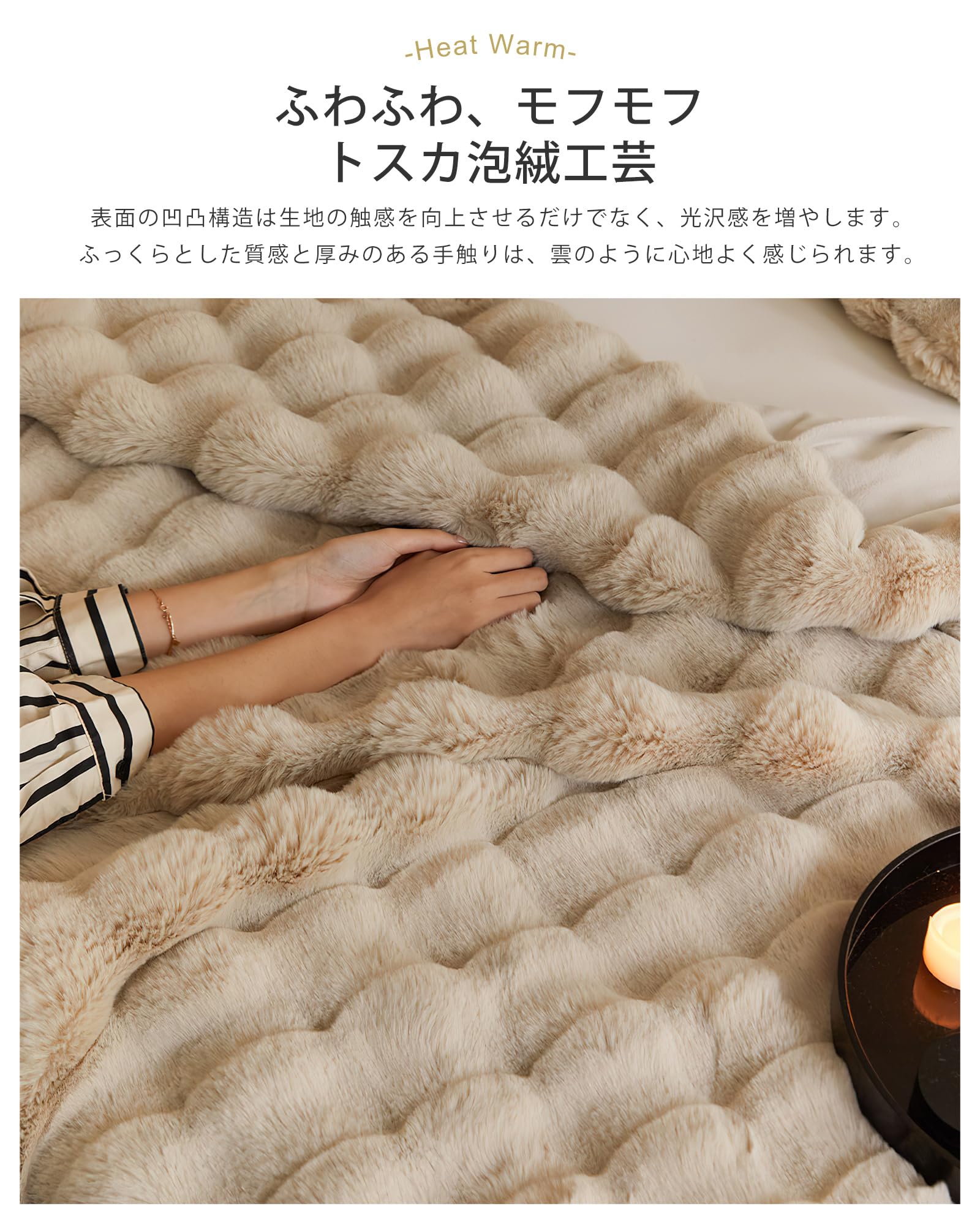 ??【サイズ・素材】 サイズは140*200cmで、素材にはラビットファー調のフェイクファー生地(ポリエステル100%)を使用。肌に触れるたびに感じる贅沢な柔らかさで、冬の寒さを快適に乗り越えられます。