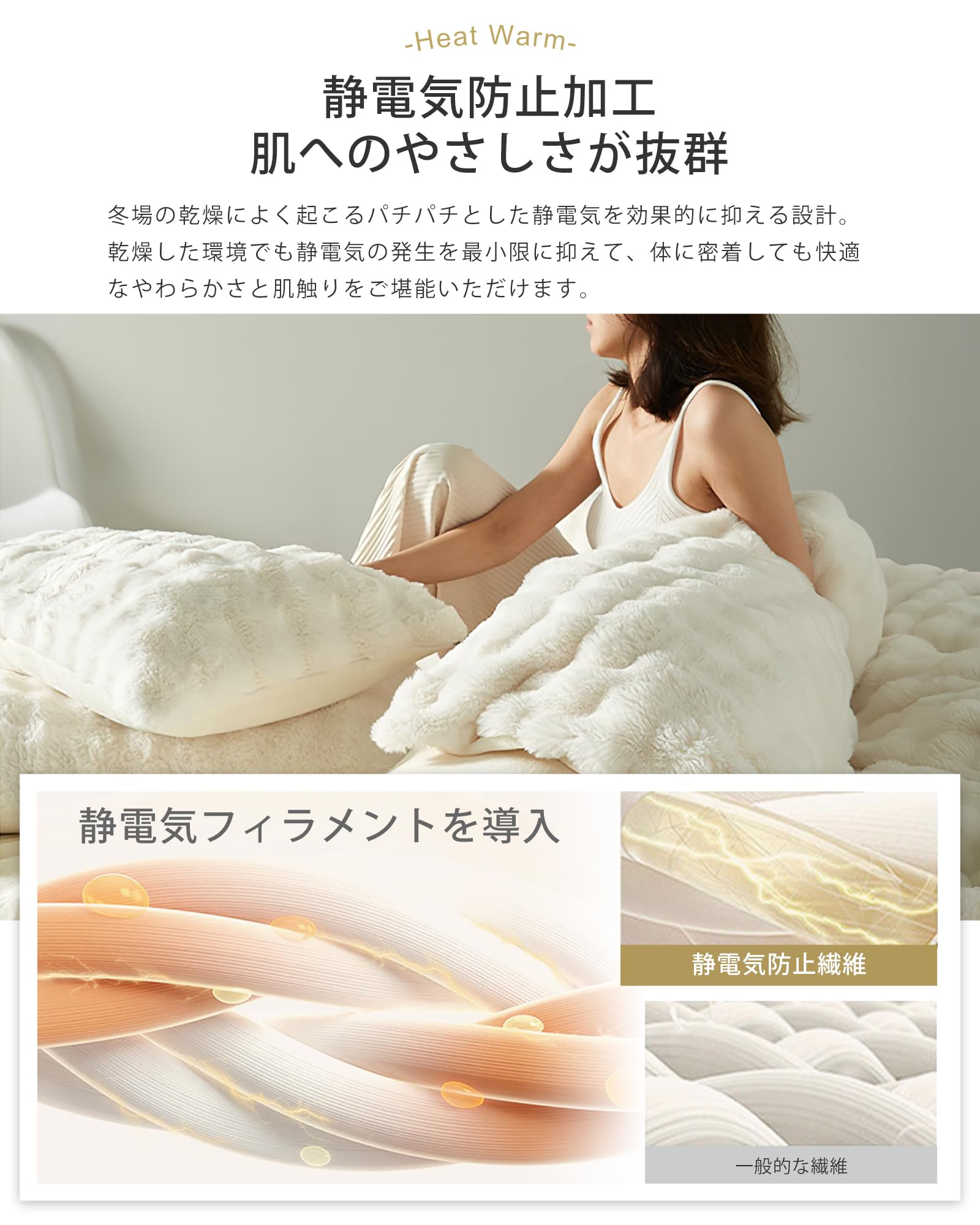 ??【優れた保温性】 長毛素材のラビットファー調生地が空気をたっぷり含むことで、暖かい空気を逃さずしっかり保温。寒い夜も暖かさをキープし、快適な眠りをお届けします。