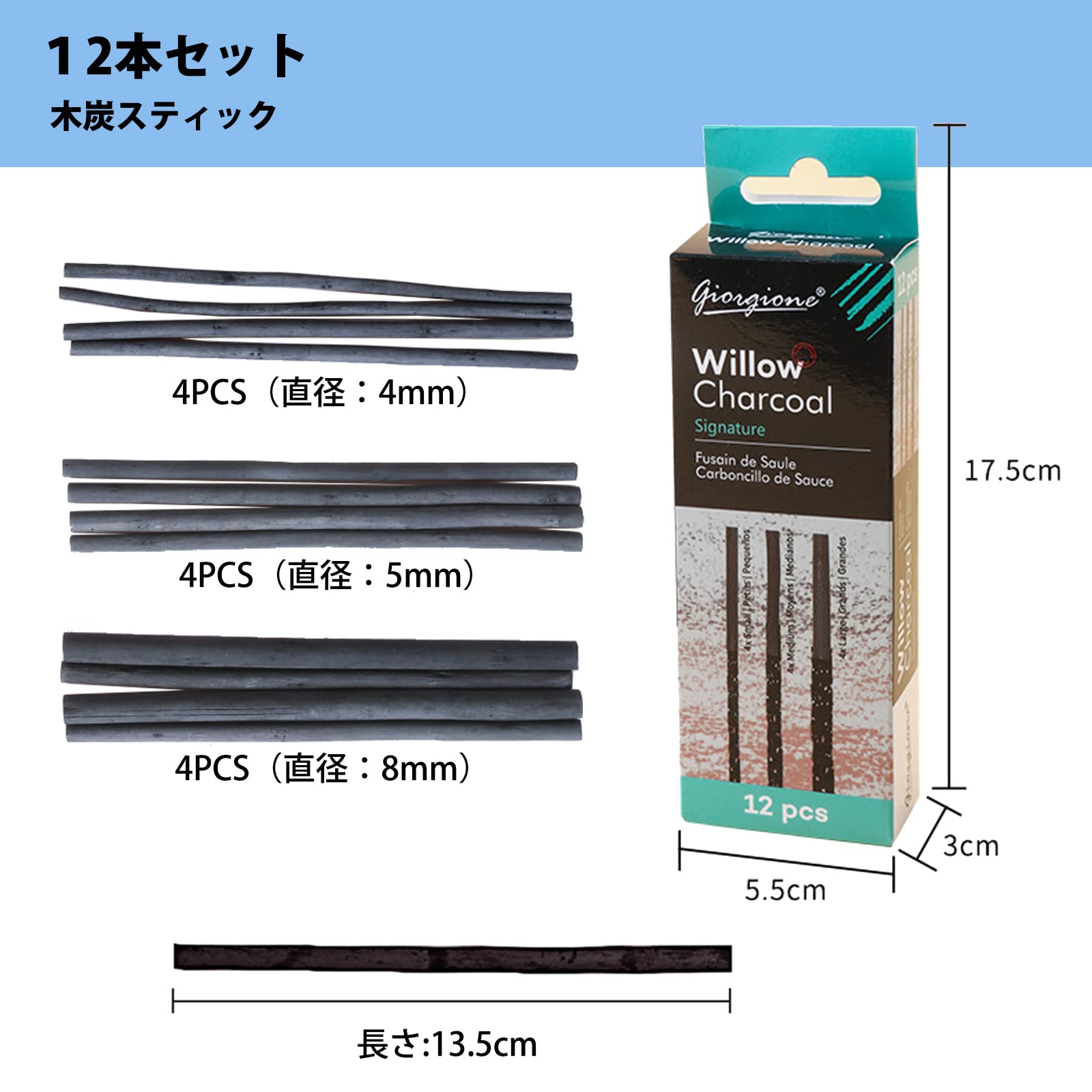 【在庫処分】DanYun 12本セット 木炭スティック 木炭 デッサン チャコール 絵画 スケッチ 木炭筆 手を汚れない 画用木炭 画材 美術用品 描画ツール 8mm 5mm 4mm